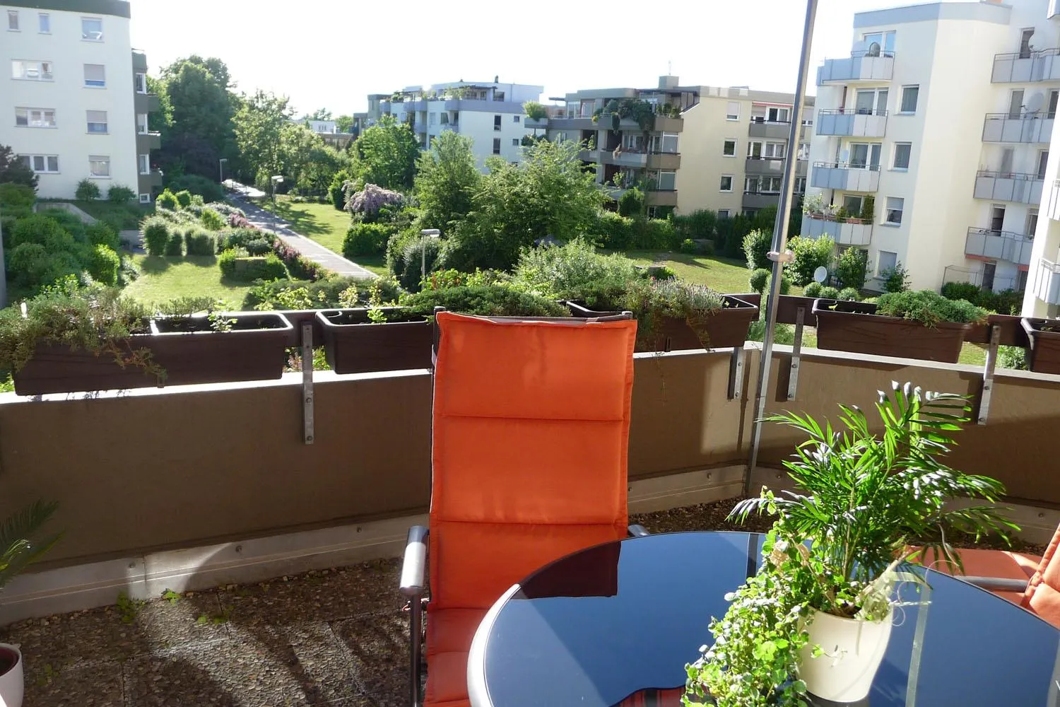 Der sonnige, ca. 16 m² große West-Balkon hat drei Zugänge und ist ruhig gelegen. Er ist überdacht und mit Steinplattenboden, Markise, Stromanschluss und einem praktischen Geräteraum ausgestattet.