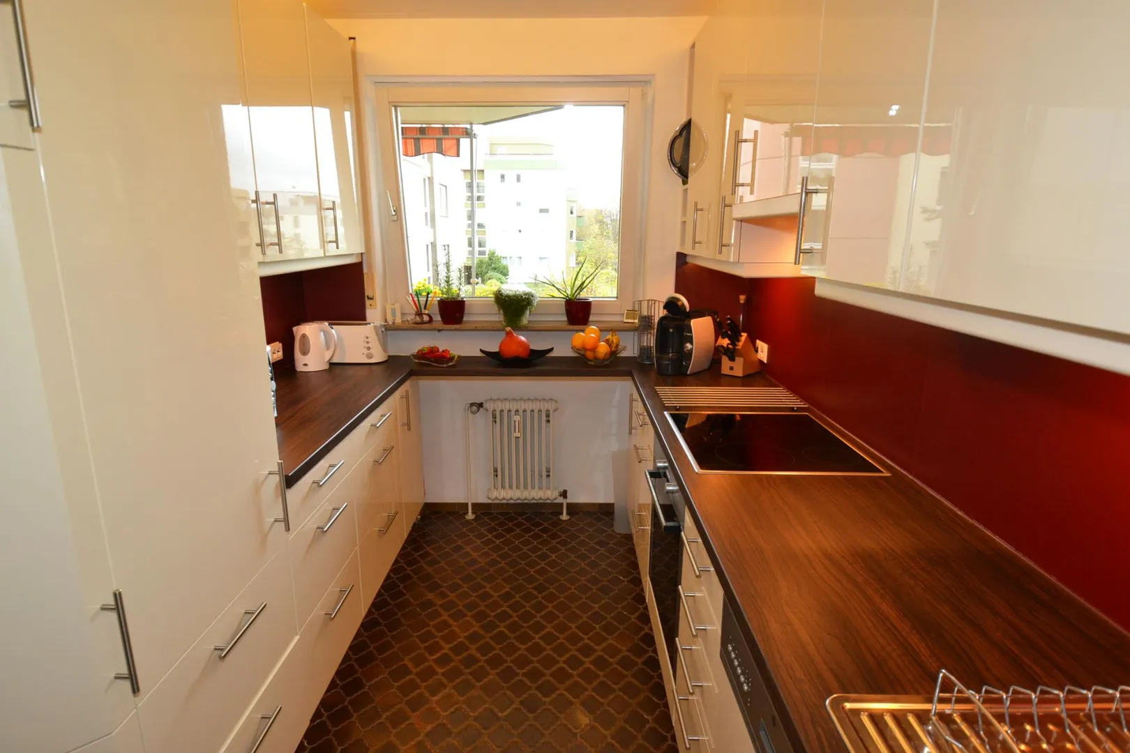 Im Zentrum der Wohnung befindet sich die Küche. Sie verfügt über eine neuwertige Einbauküche von 2010. Diese ist u.a. ausgestattet mit Kühl-/Gefrierschrank, Induktionskochfeld und Backofen, Umluft-Dunstabzug, Spülmaschine, Mikrowelle sowie ausreichend Stauraum in Ober- und Unterschränken. Die Front der Einbauküche ist hochglanz weiß.
