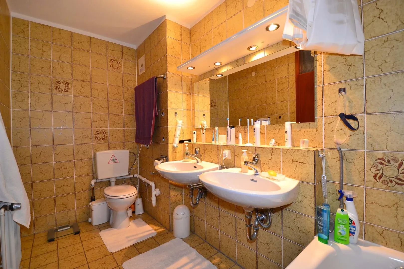 Das Badezimmer ist raumhoch gefliest und mit Badewanne, WC, 2 Waschbecken, großem Spiegel inkl. Beleuchtung und elektrischer Lüftung ausgestattet.