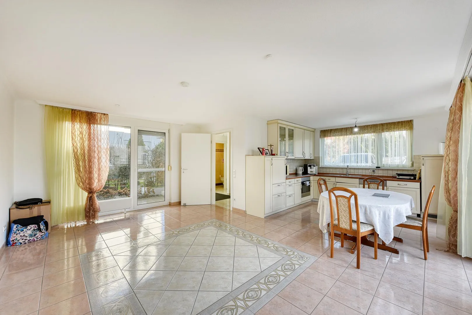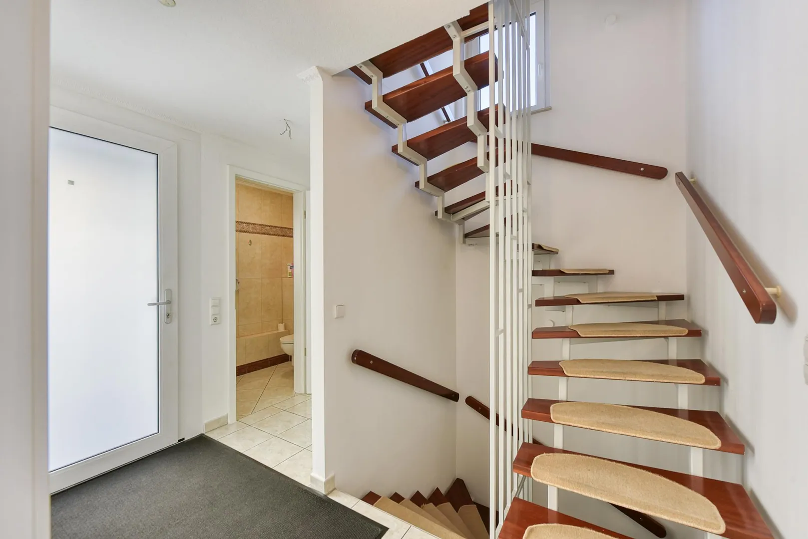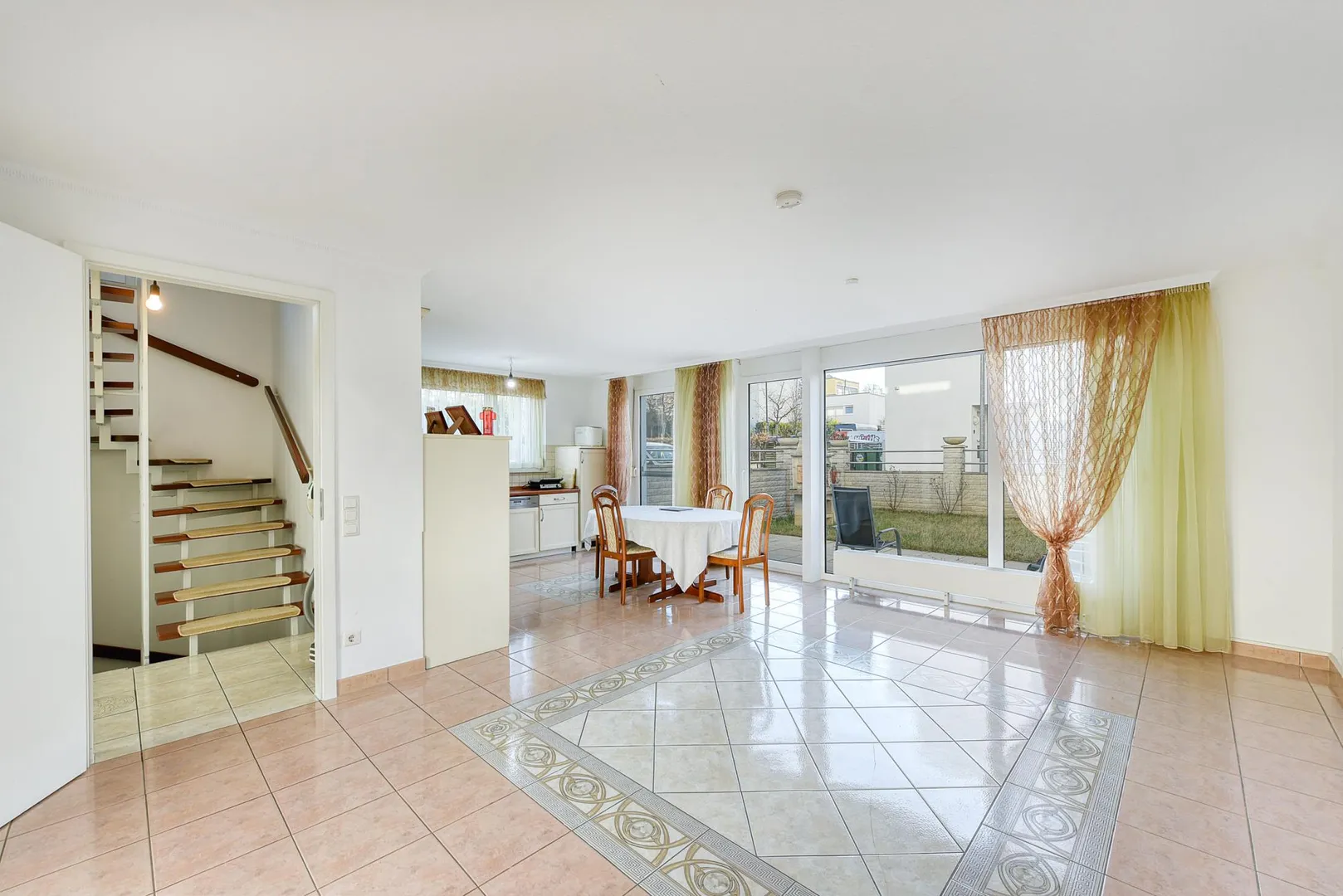 Im Erdgeschoss befinden sich der Hauseingang, das separates WC mit Fenster, der offene Wohn-/Ess-Küchenbereich, zwei Terrassen sowie der Garten. Die Böden sind gefliest. Die Raumhöhe beträgt ca. 2,41 Meter.