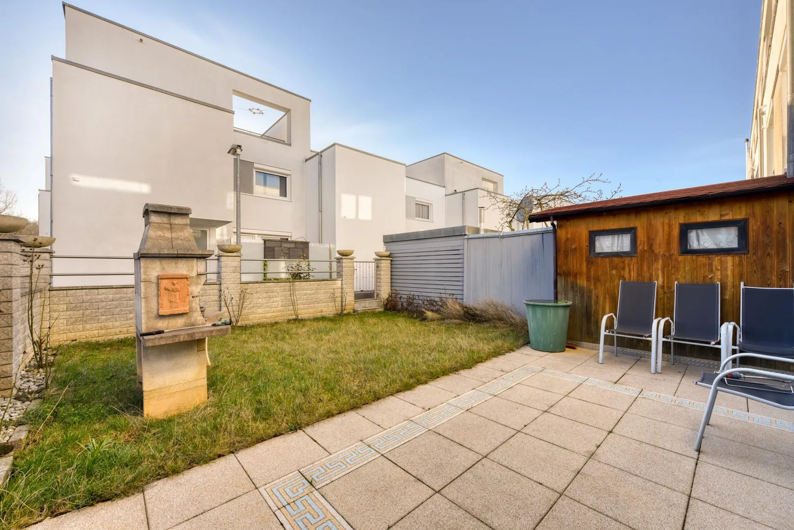 Im Garten befinden sich ein Gerätehäusle und ein Steingrill.