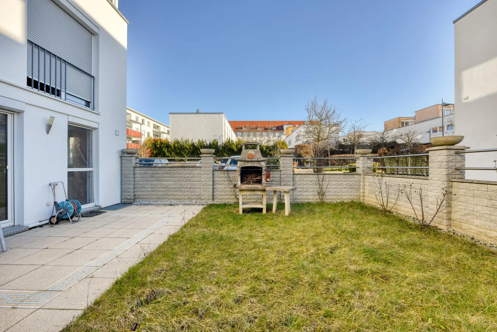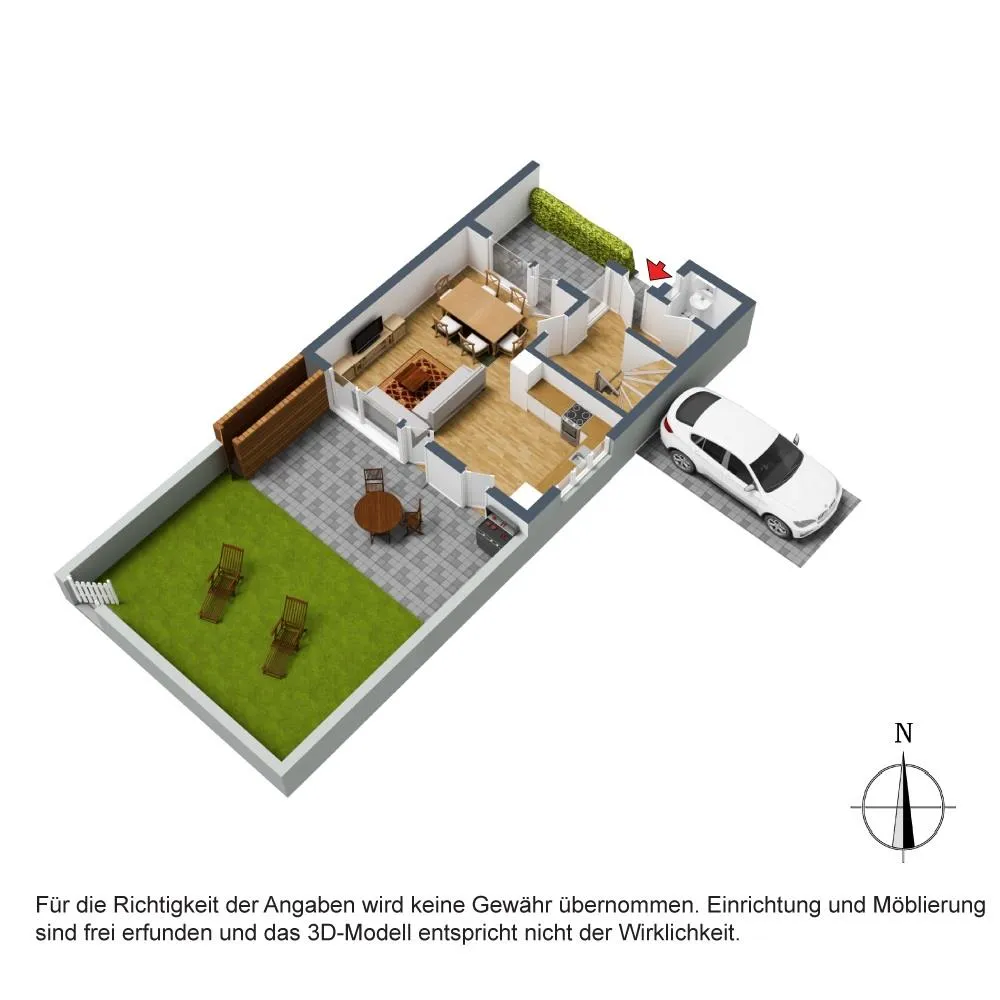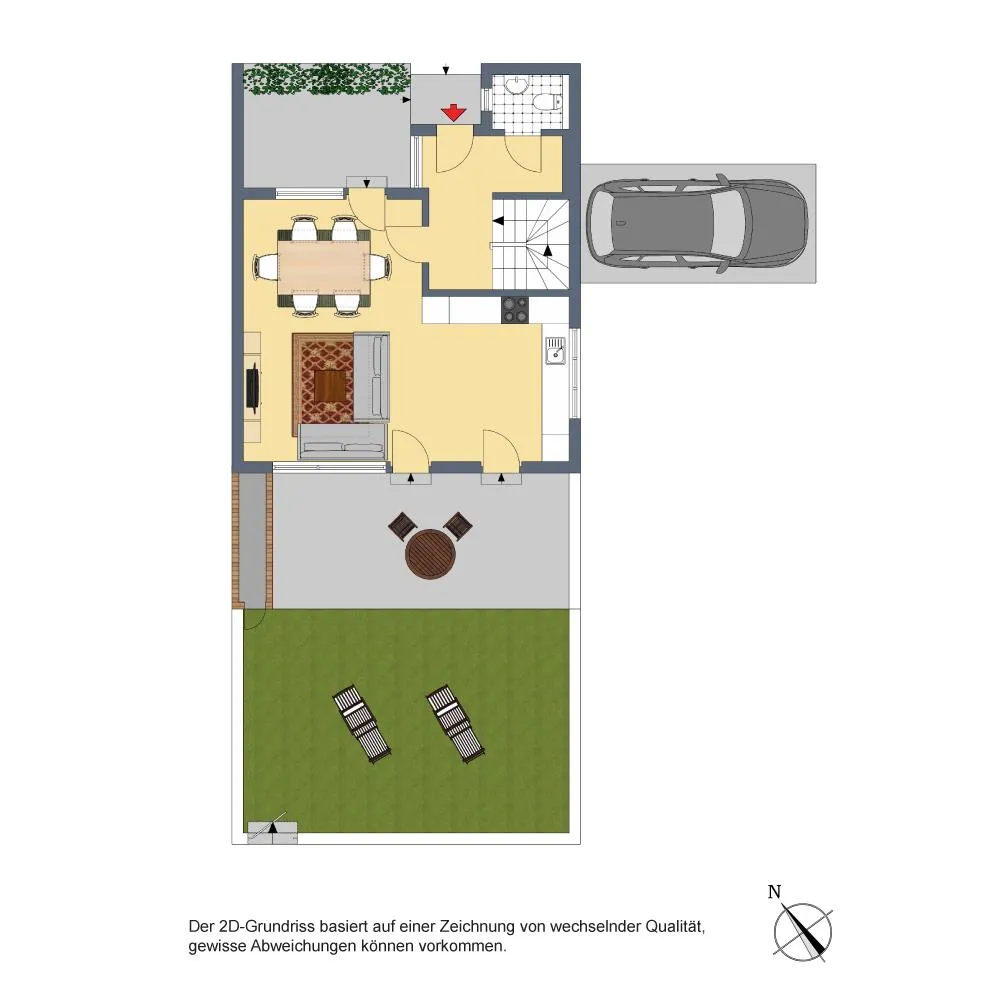 Das Grundstück ist eben und rechteckig. Die Terrasse und der Garten sind nach Süd-Westen ausgerichtet. Der Hauseingang ist auf der Nord/Ost-Hausseite.