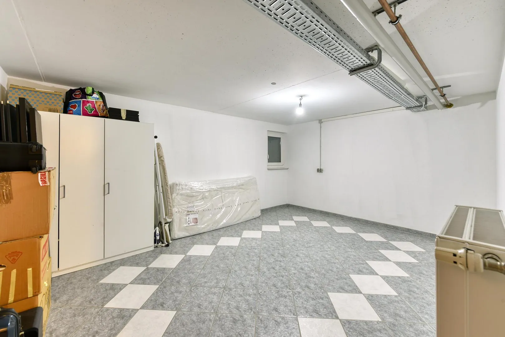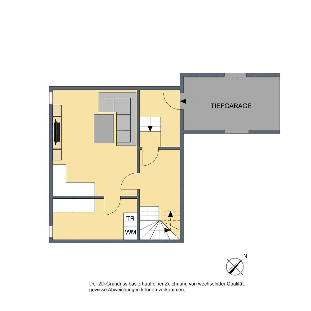 Im Untergeschoss befinden sich ein Hobbyraum mit Heizkörper und Fenster, ein Abstellraum mit Waschmaschinen-Anschluss sowie der Garagen-Zugang und der Kfz-Stellplatz in der Tiefgarage. Die Böden sind gefliest. Die Raumhöhe beträgt ca. 2,24 Meter.