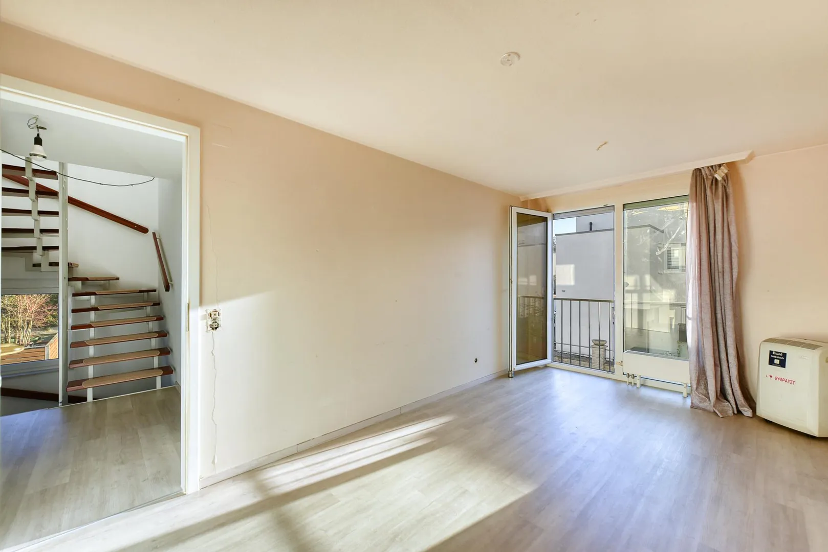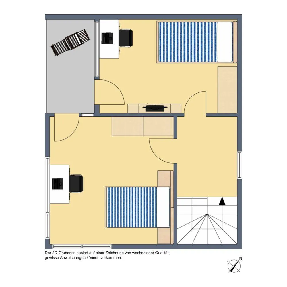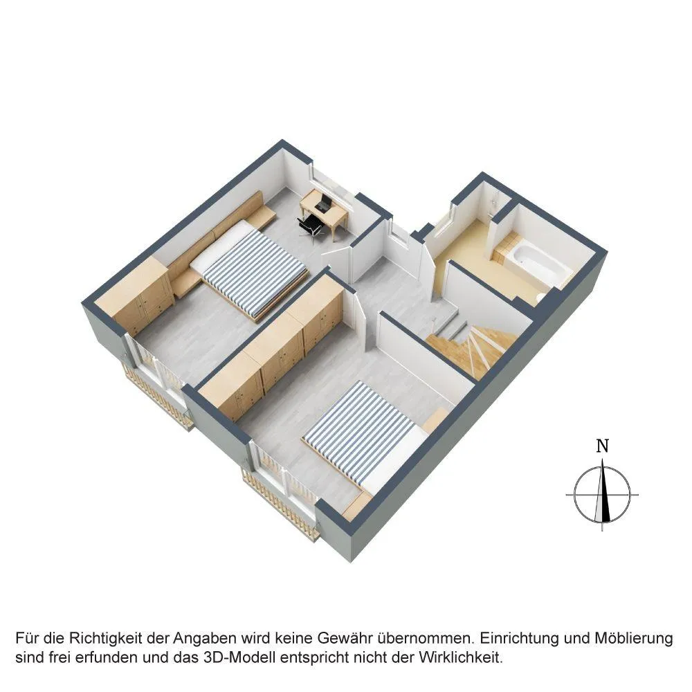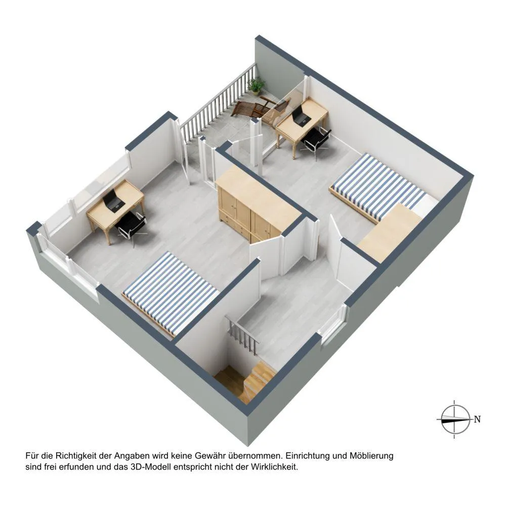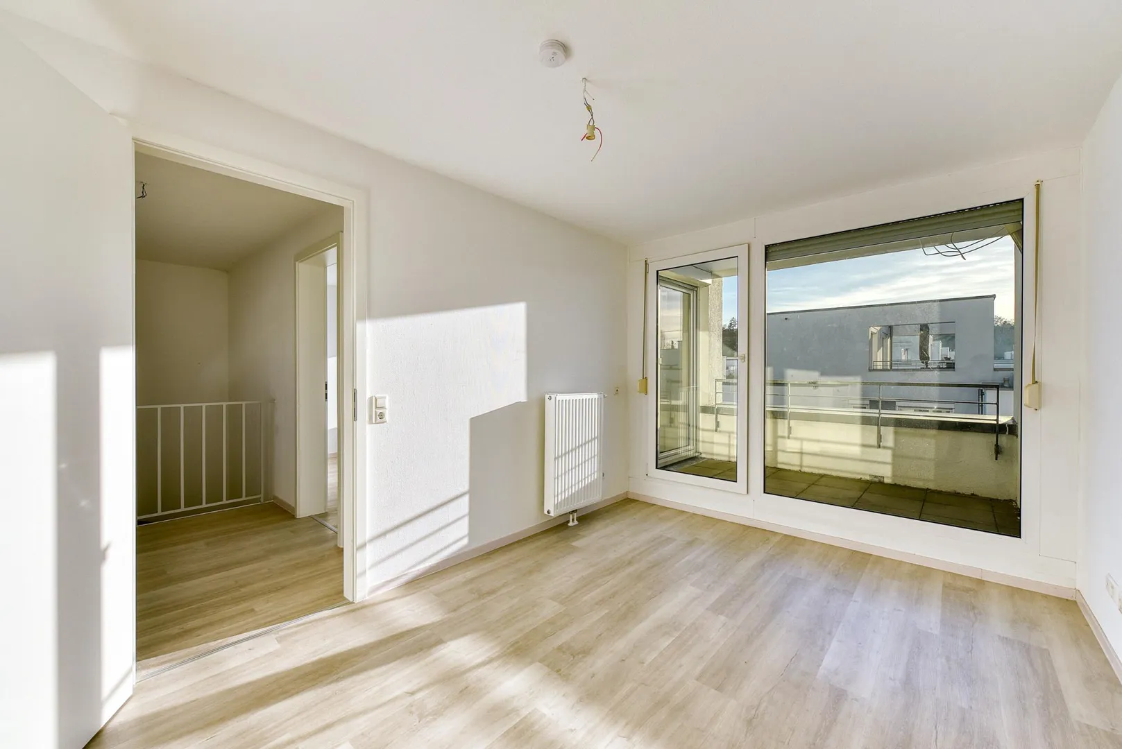 Im Dachgeschoss befinden sich zwei weitere Zimmer, jeweils mit Terrassen-Zugang. Im Flur sowie in den Zimmern sind Vinyl-Böden verlegt. Die Raumhöhe beträgt ca. 2,42 Meter.