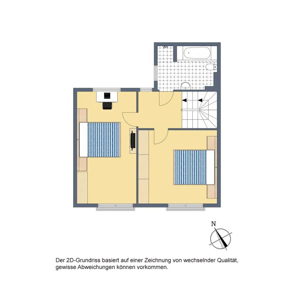 Im Obergeschoss befinden sich zwei Zimmer sowie das Badezimmer mit Fenster. Im Flur sowie in den Zimmern sind Vinyl-Böden verlegt. Die Raumhöhe beträgt ca. 2,42 Meter.