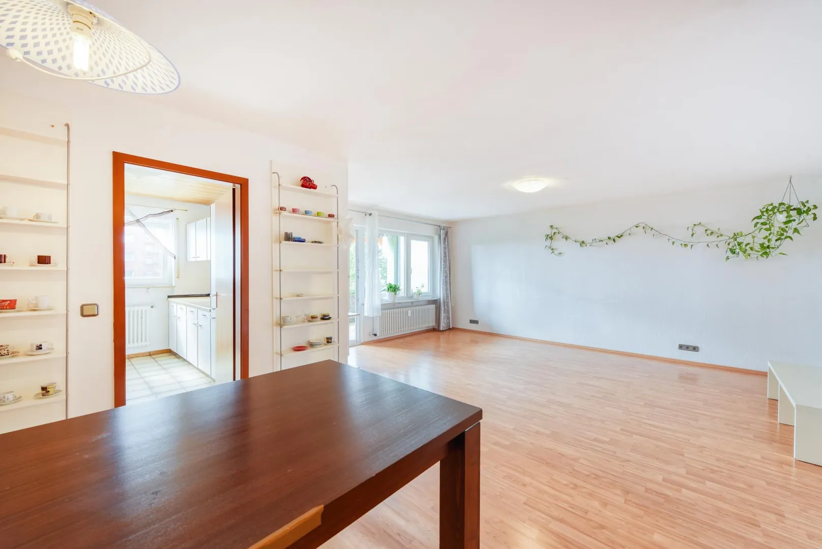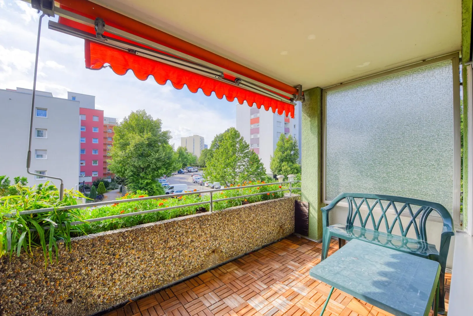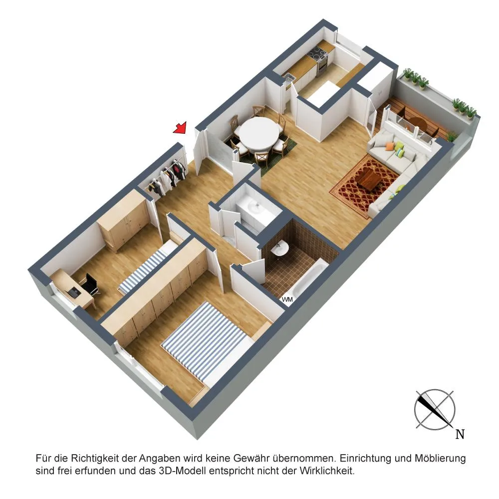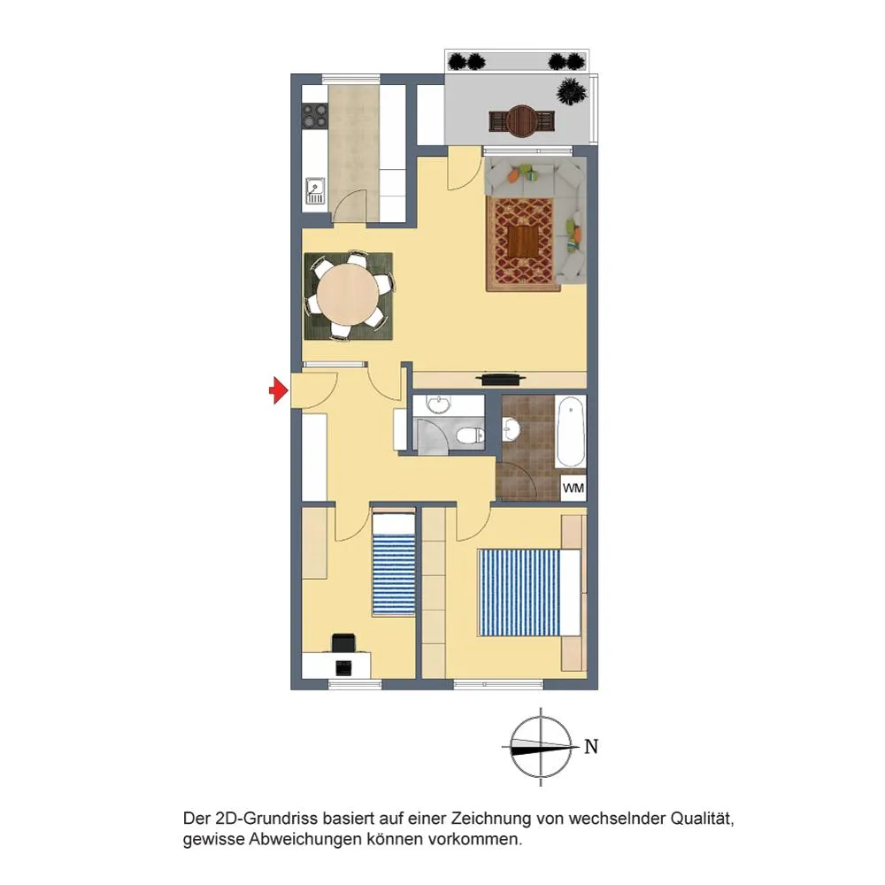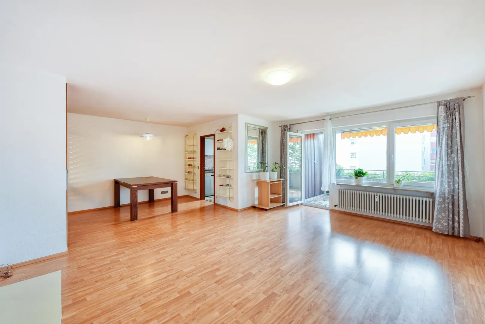 Der Grundriss ist gut. Alle Zimmer sind vom Flur aus begehbar. Der ca. 6 m² große und überdachte Balkon mit Abstellraum und Markise sowie die Küche sind über das Wohnzimmer begehbar. Das Badezimmer und das separate WC sind innenliegend.