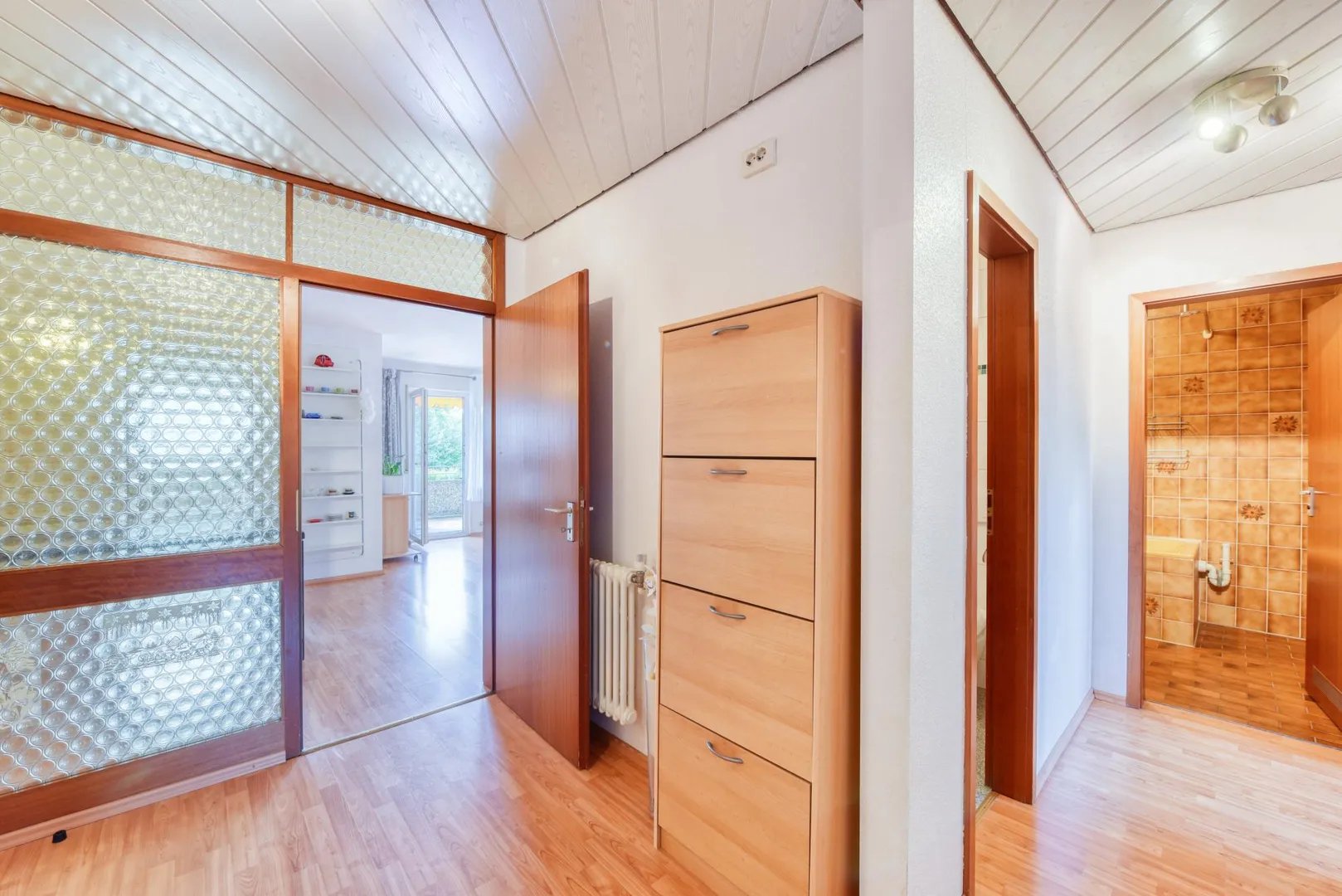 Die Zimmer und der Flur sind mit Laminatböden ausgestattet. Die Wände sind überwiegend tapeziert. Die Decken sind teilweise mit Paneelen ausgestattet. Die Raumhöhe beträgt ca. 2,40 Meter. Die Wohnung befindet sich in einem gepflegten Zustand.