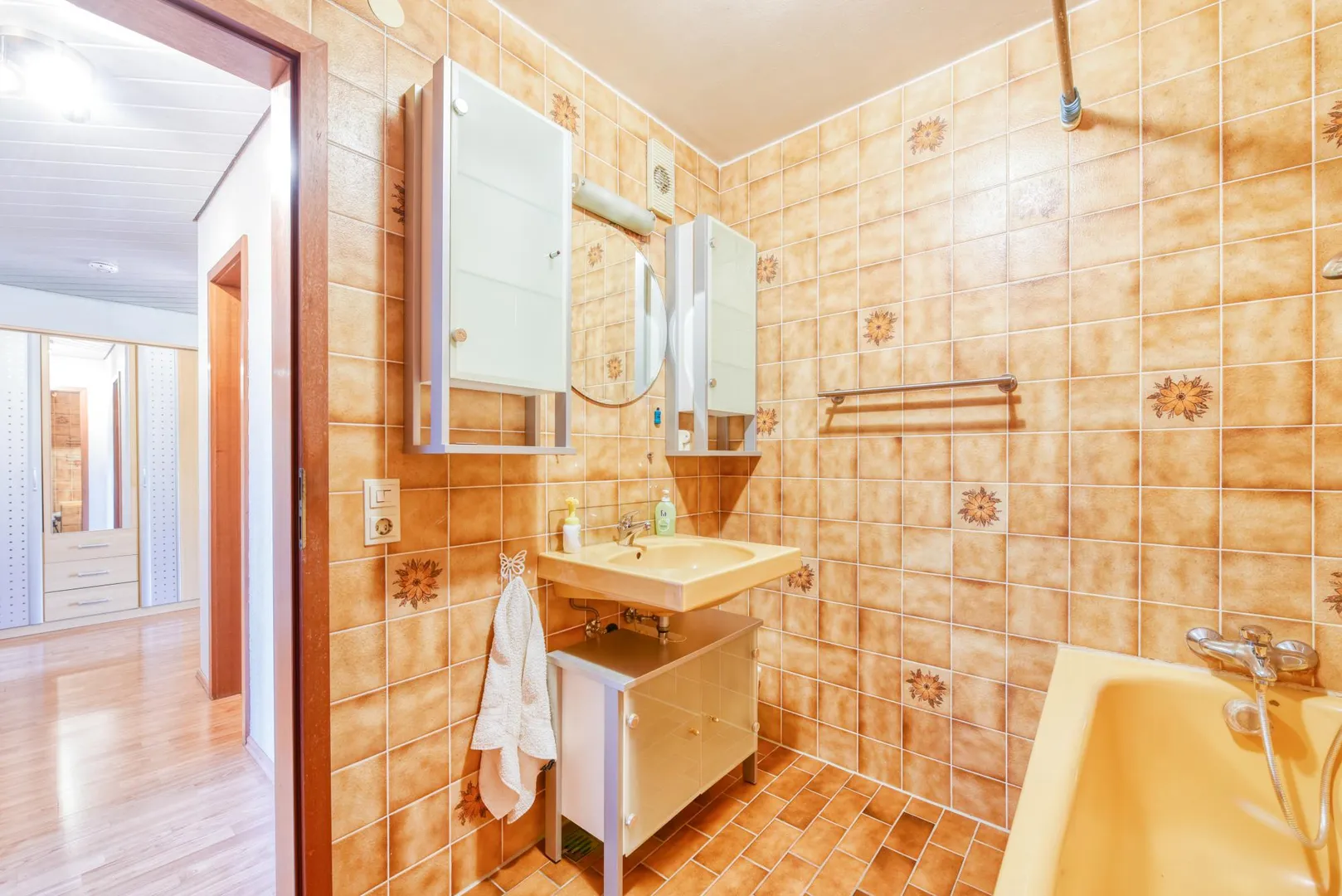 Die Einbauküche ist ausgestattet mit einem Fliesenboden, einem Abzug nach außen sowie einer Einbauküche. Die Möbel sind schon etwas älter. Die Elektrogeräte sind modern und funktionsfähig. Für die künftige Funktionsfähigkeit der E-Geräte übernimmt der Vermieter keine Haftung.