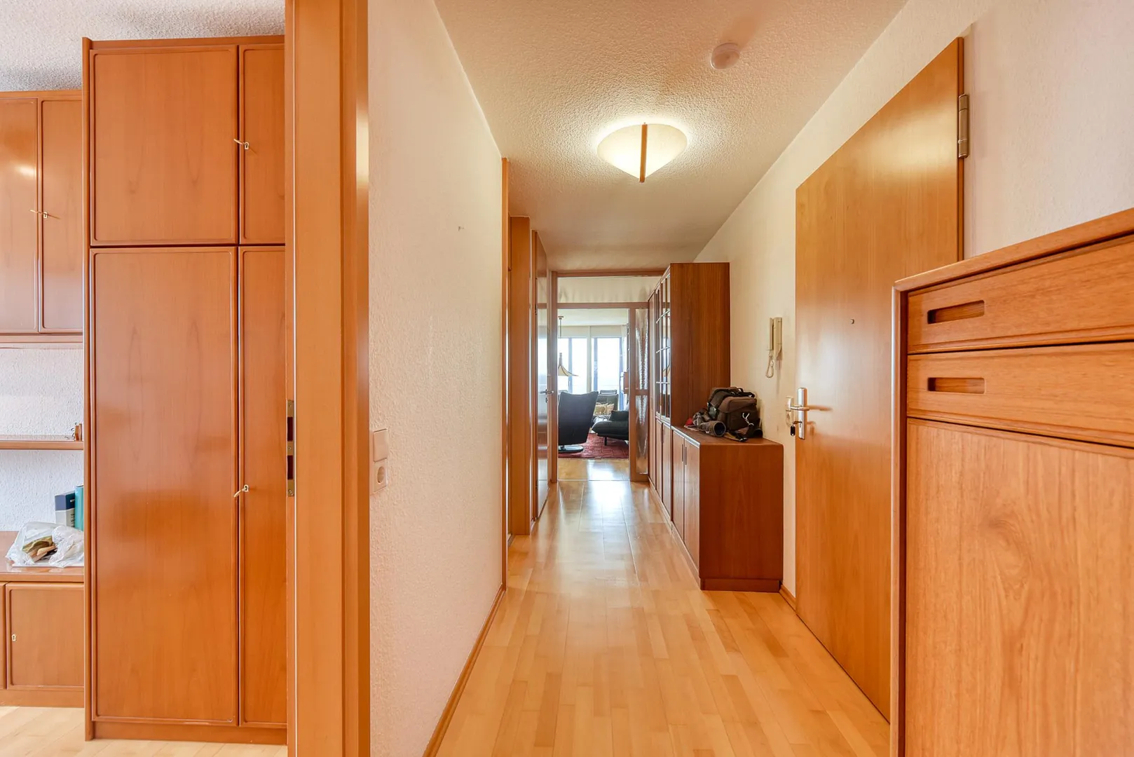 Die Wände sind überwiegend mit Raufasertapeten tapeziert und weiß gestrichen. Die Raumhöhen betragen ca. 2,37 Meter.