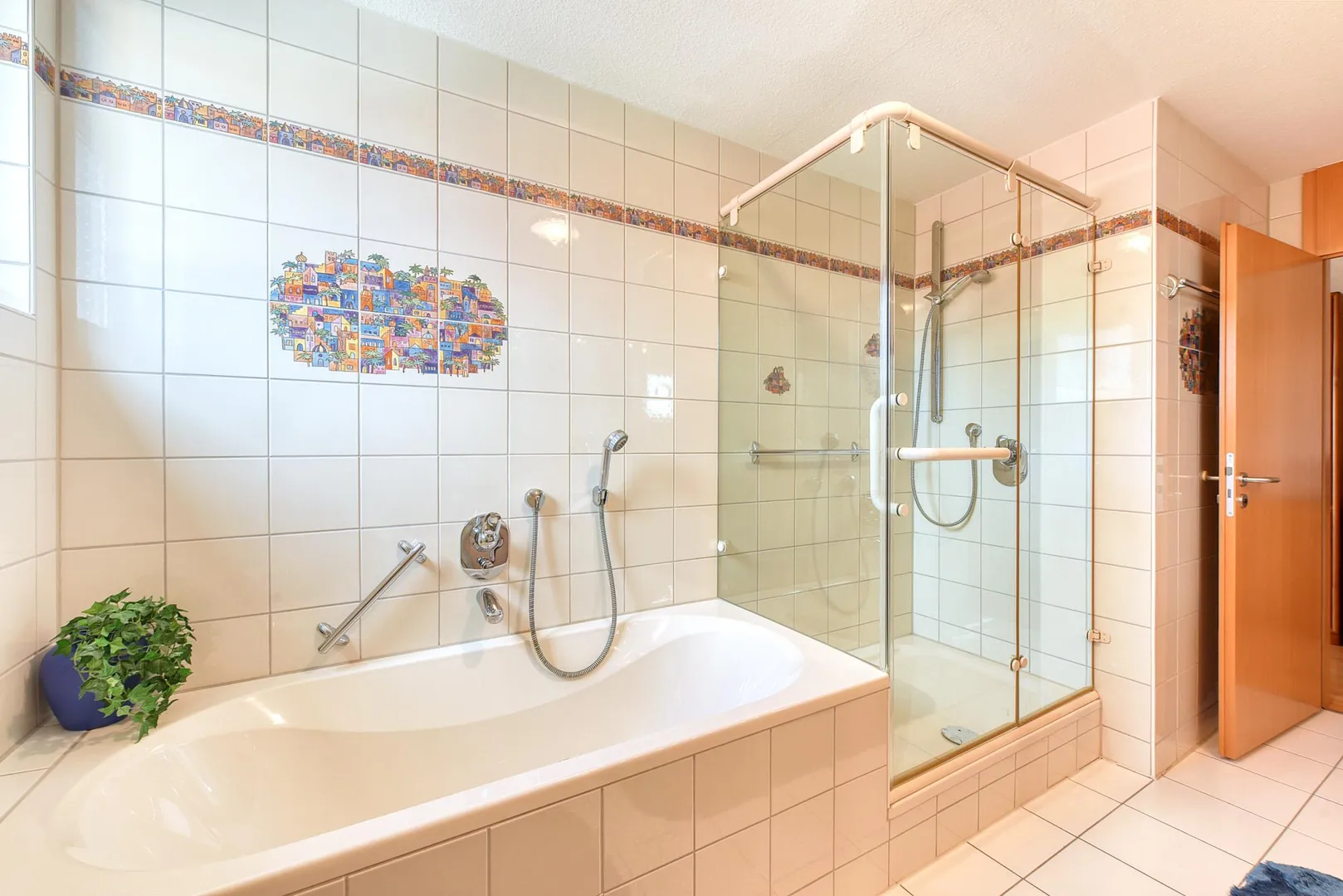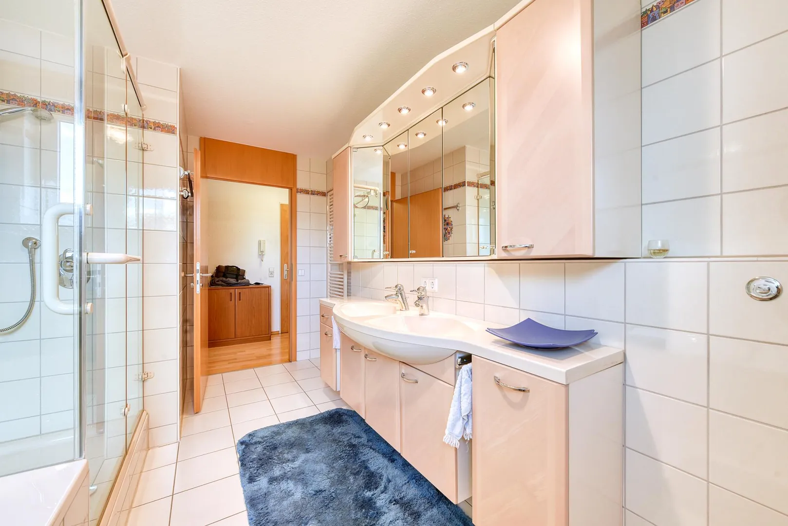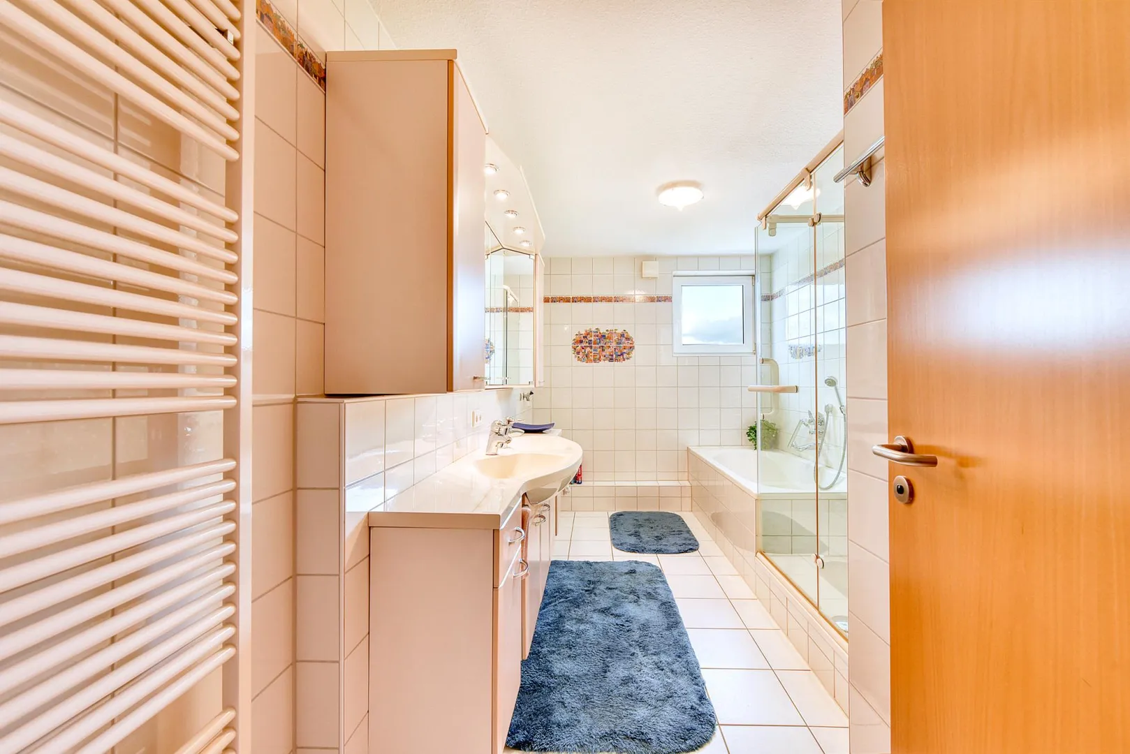 Das raumhoch geflieste Badezimmer mit Fenster ist ausgestattet mit einer Badewanne, einer Dusche, einem Doppel-Waschbecken, einem Waschmaschinen-Anschluss, einem Handtuch-Heizkörper sowie Badmöbeln.