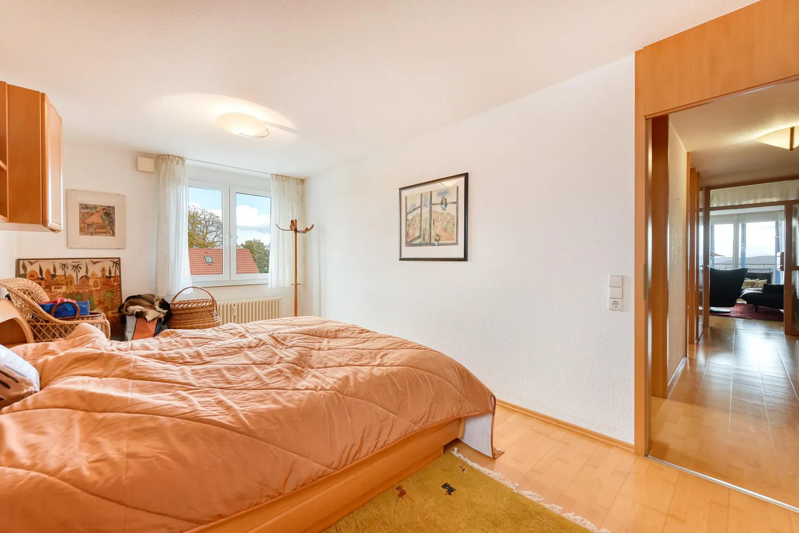 Der Flur sowie die Zimmer sind mit Parkettböden ausgestattet. Die restlichen Räume sind gefliest.