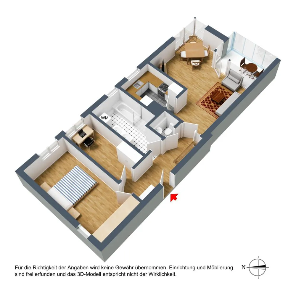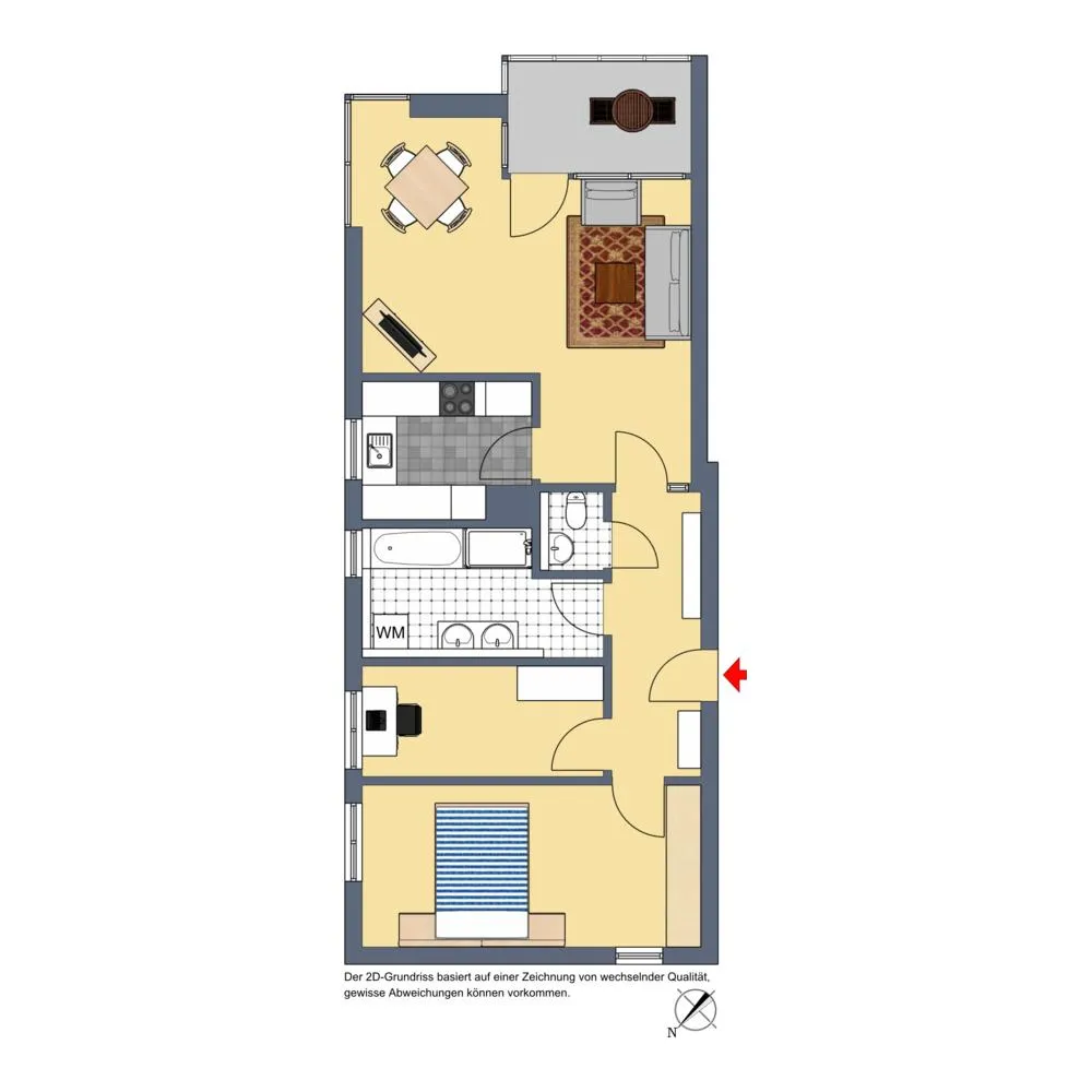 Der Grundriss ist gut: alle Zimmer sind vom Flur begehbar. Die Küche ist über das Wohnzimmer begehbar. Das Badezimmer verfügt über ein Fenster. Der ca. 6 m² große Balkon ist mit bodentiefen Glas-Falt-Schiebetüren ausgestattet und ist somit auch als Wintergarten ganzjährig nutzbar. Der Wintergarten ist mit einer elektrischen Markise ausgestattet. Das separate WC ist innenliegend.