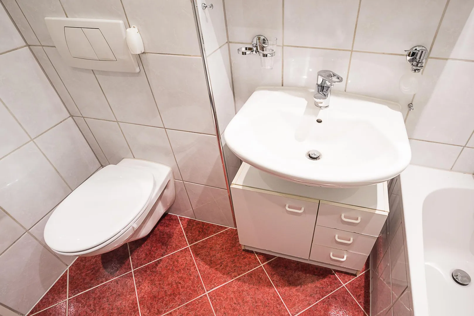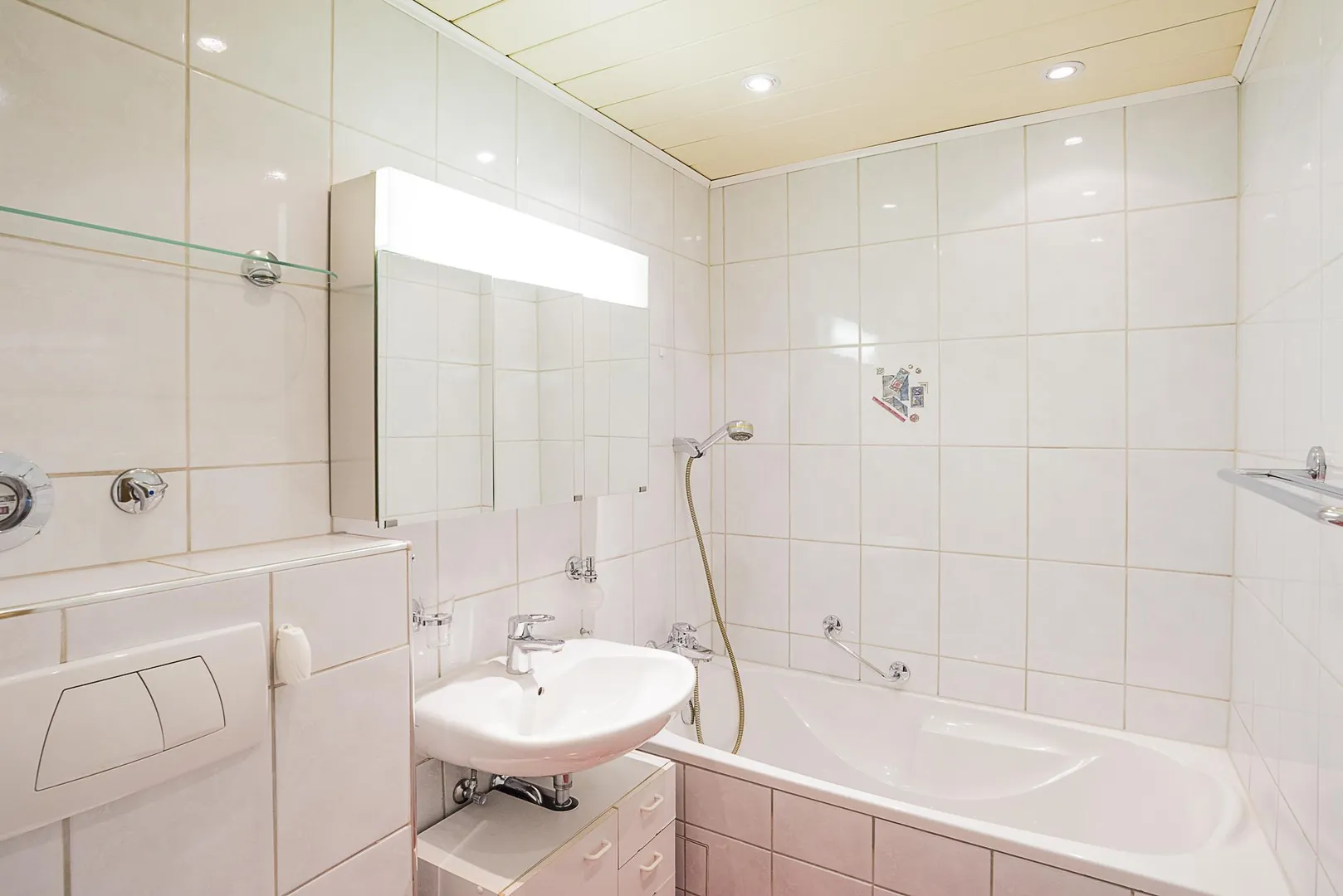 Das raumhoch geflieste Badezimmer ist ausgestattet mit einer Badewanne, einem WC, einem Spiegelschrank und einem Waschtisch-Unterschrank.