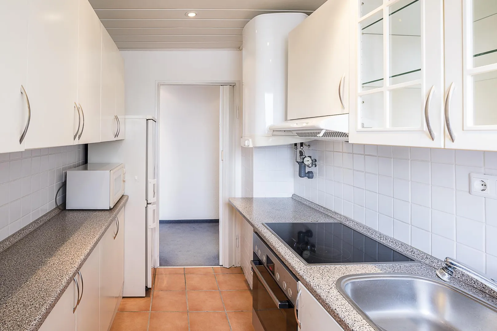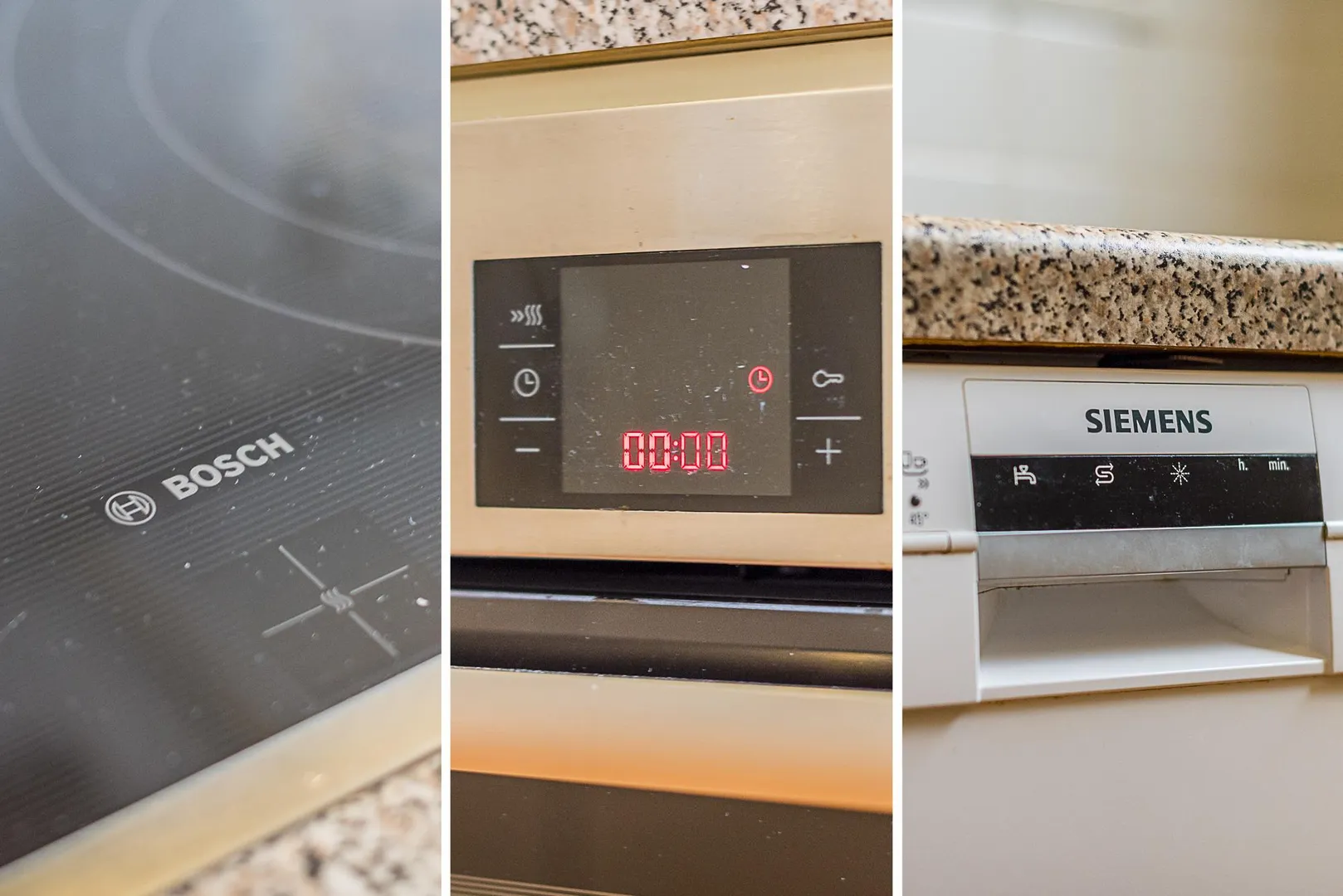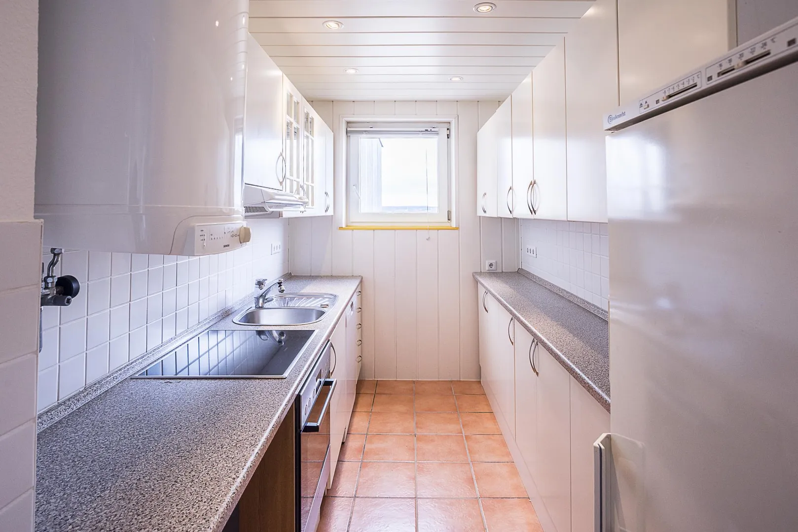 Die Küche ist mit einer gepflegten Einbauküche ausgestattet. Bis auf den Kühl- und Gefrierschrank wurden die Elektro-Geräte modernisiert. In der Küche befindet sich Platz für eine Waschmaschine. Ein Waschmaschinenanschluss ist vorhanden. Für die künftige Funktionsfähigkeit der E-Geräte übernimmt der Vermieter keine Haftung.