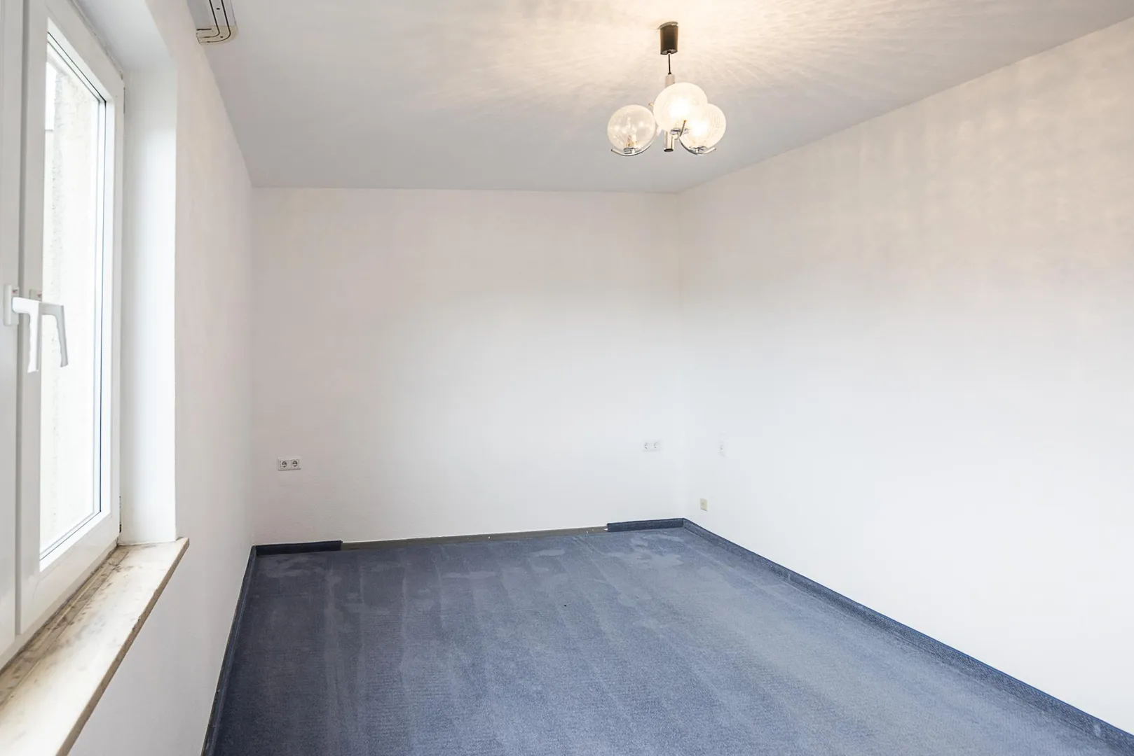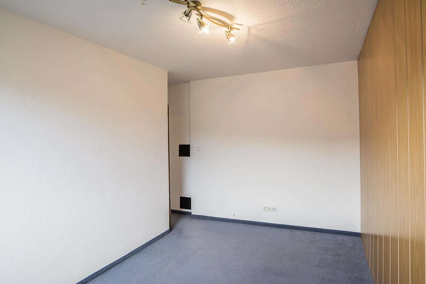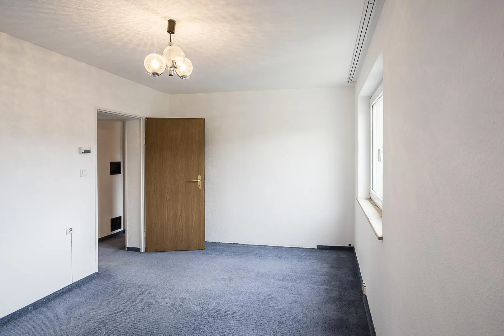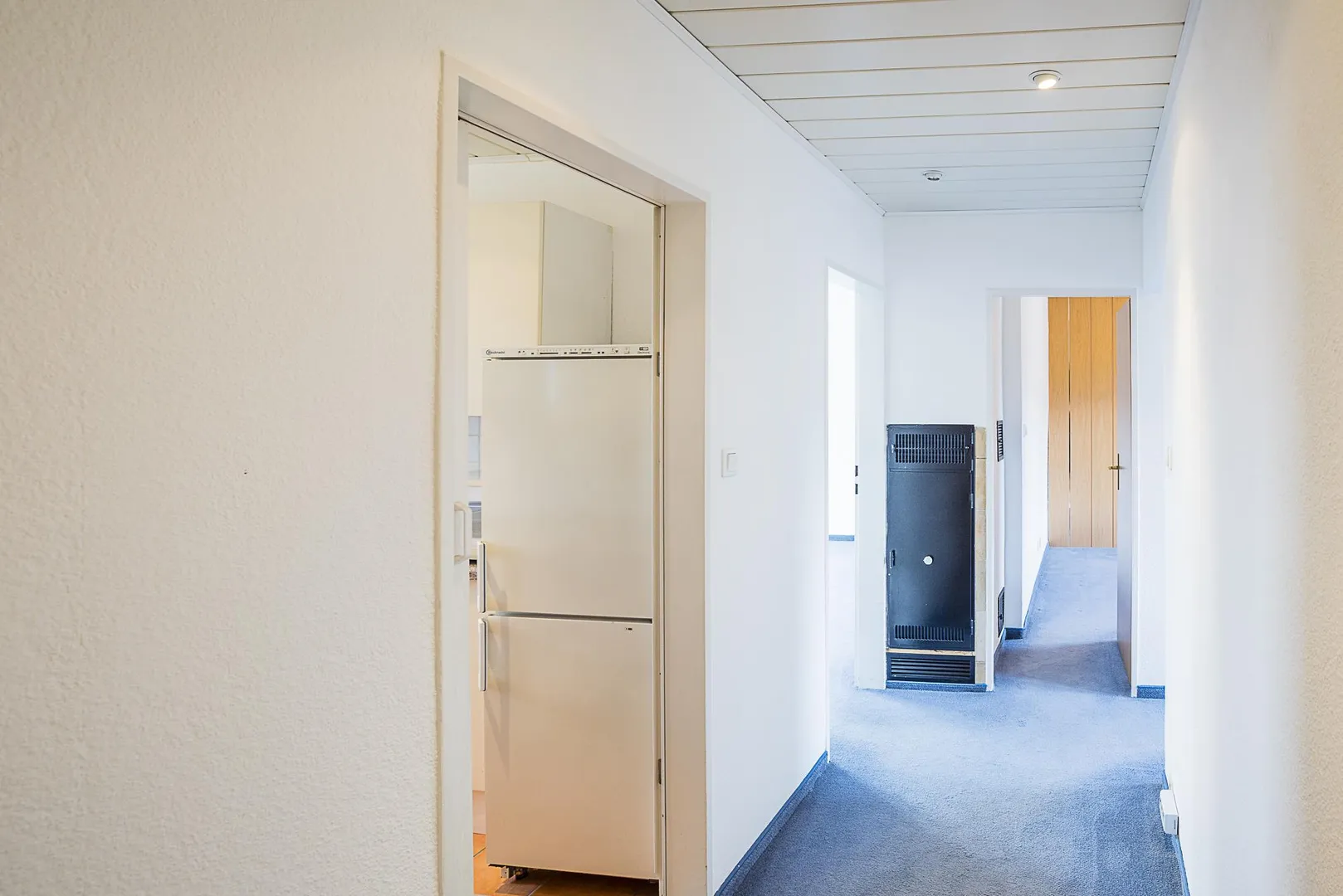 Die Wände sind überwiegend mit Raufasertapeten tapeziert und wurden frisch, weiß gestrichen.
