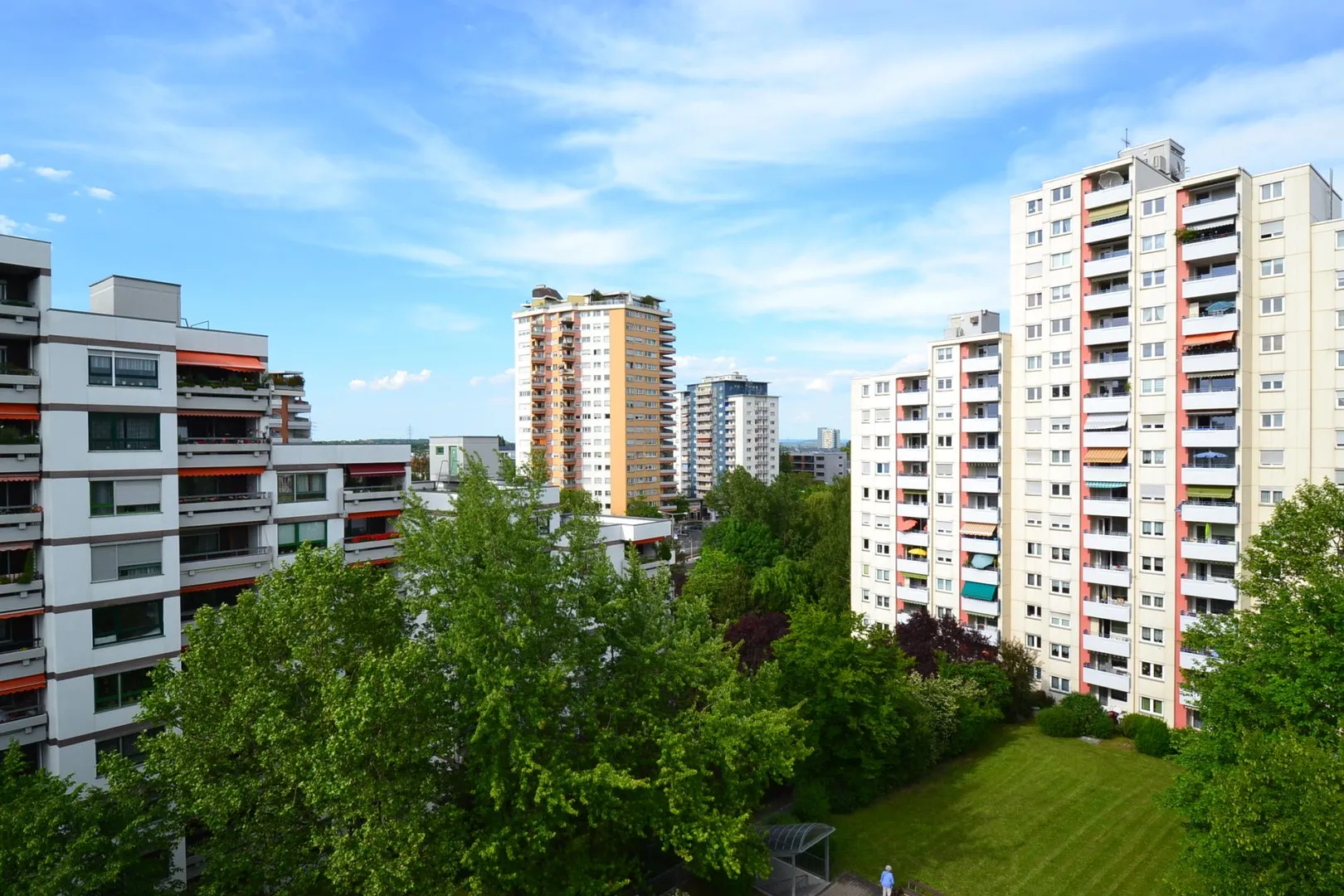 Diese renovierte und großzügige 2-Zimmer-Wohnung mit Fernblick und Abendsonne befindet sich im 6. Obergeschoss eines 15-Familien-Reiheneck-Hochhauses.