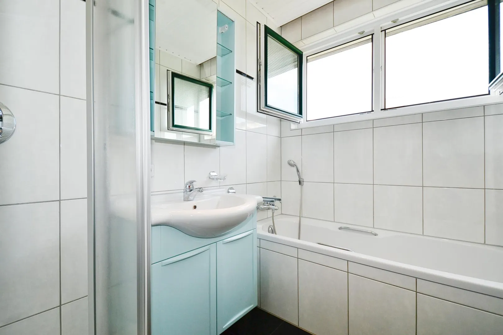 Das raumhoch geflieste Badezimmer ist ausgestattet mit einer weißen Holzdecke, einer Badewanne, einer Dusche, einem Handtuchheizkörper, einem Spiegelschrank sowie einem Waschtisch-Unterschrank.