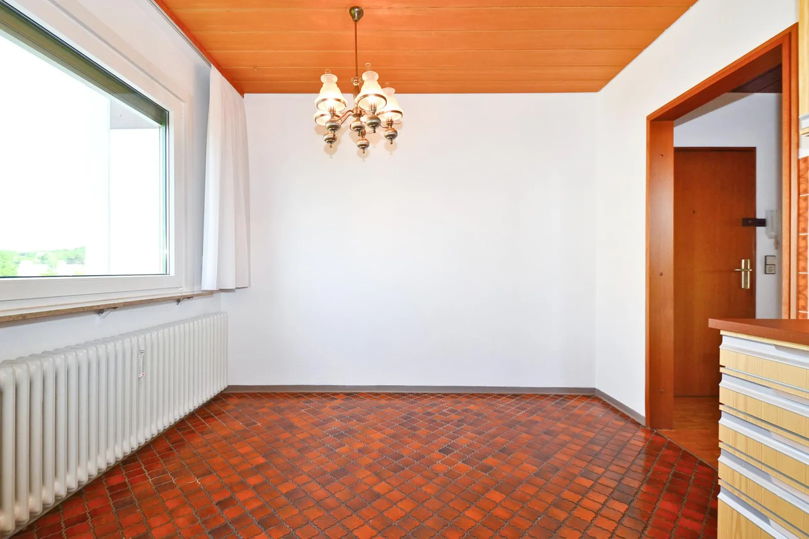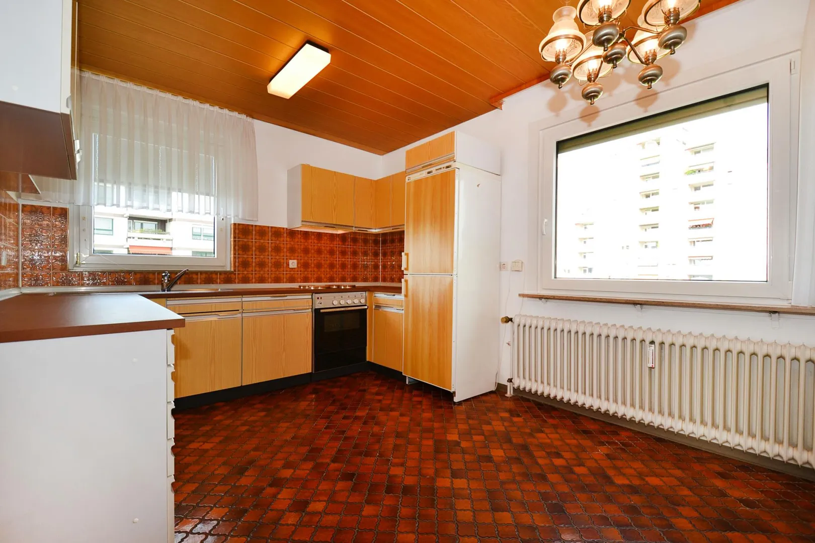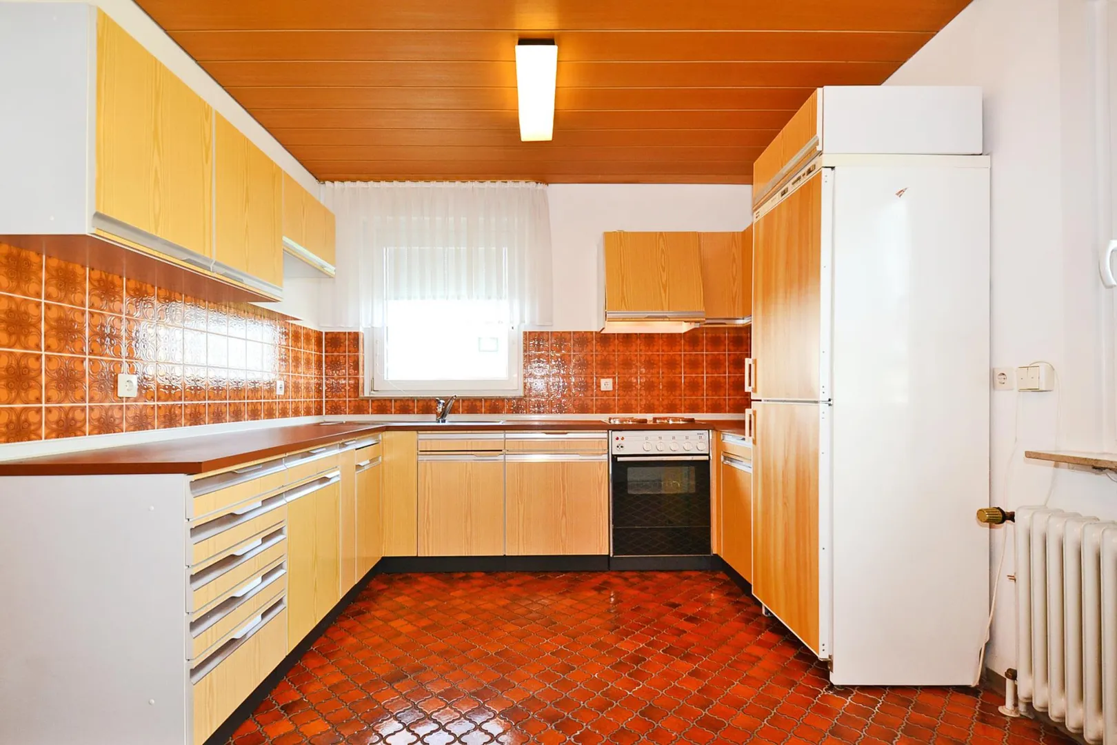 Die ältere Küche ist mit älteren Möbeln ohne Elektro-Geräte ausgestattet. Die Einbauküche darf auf eigene Kosten ausgetauscht werden.
