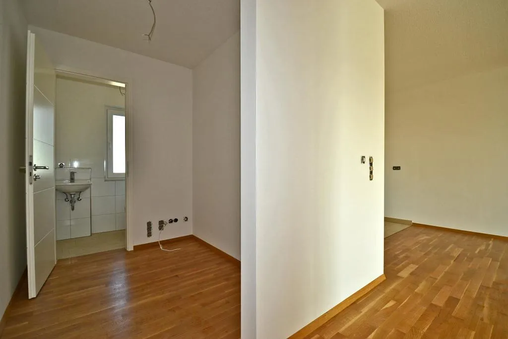 In den Zimmer und im Flur ist massives Eiche-Parkett verlegt. Die Böden in der offenen Küche, im Badezimmer und im separaten WC sind gefliest.