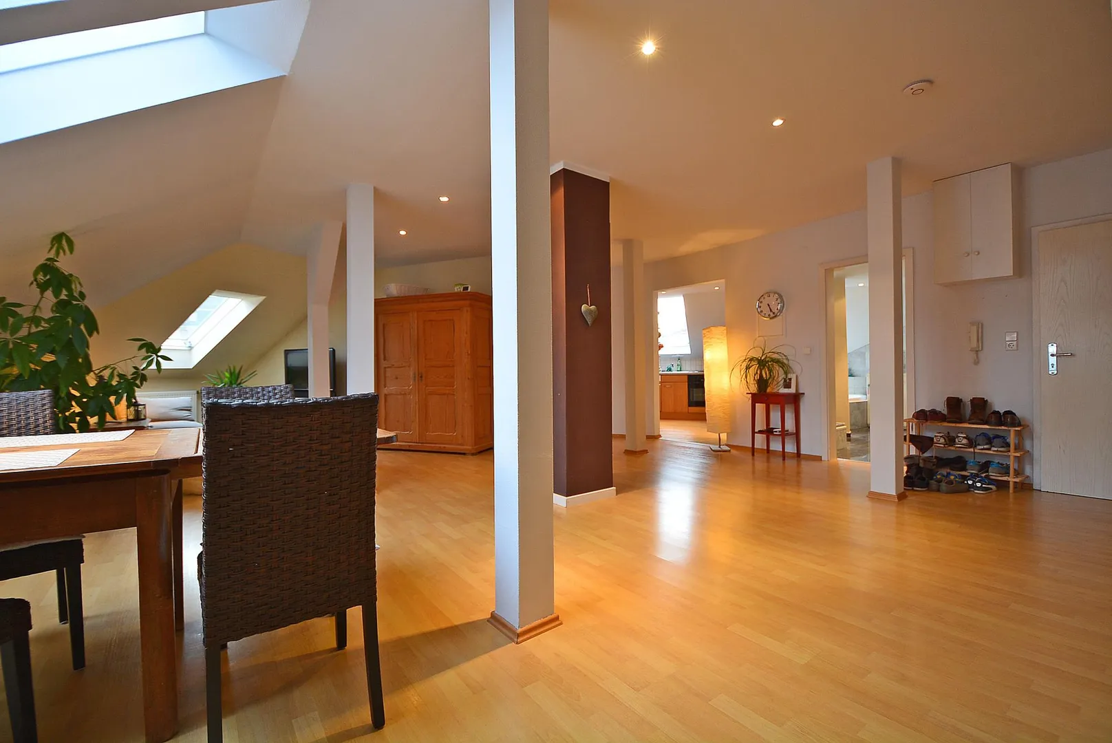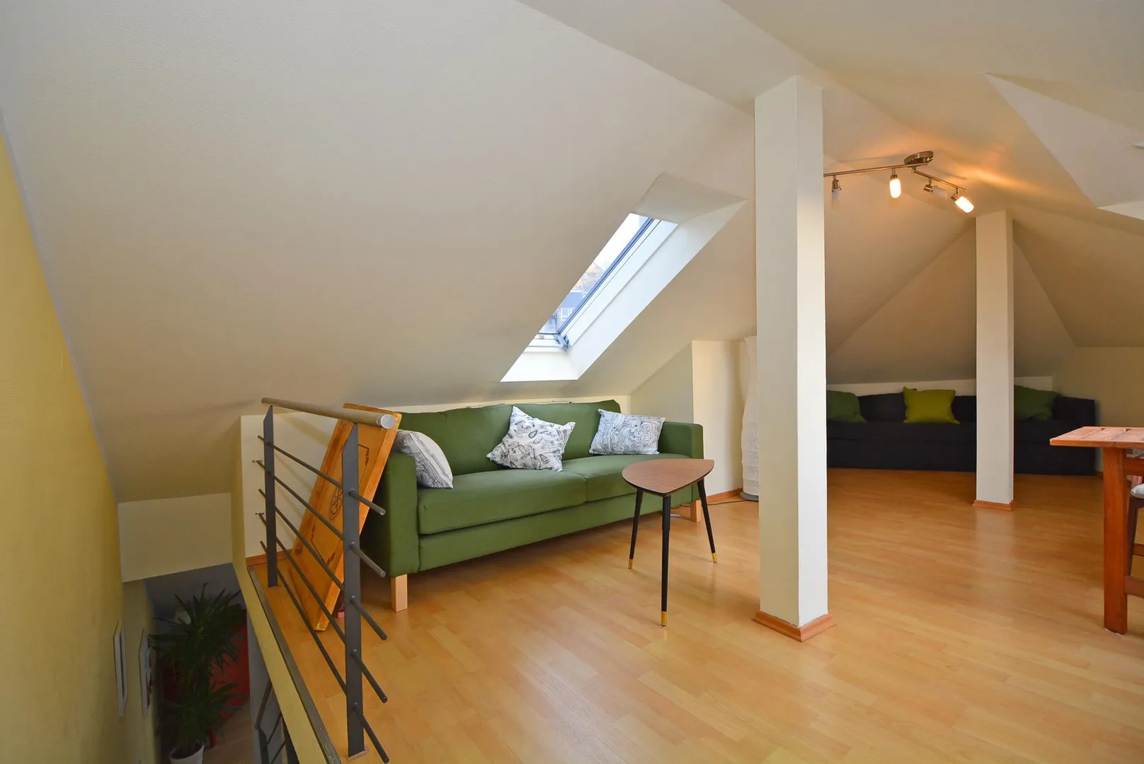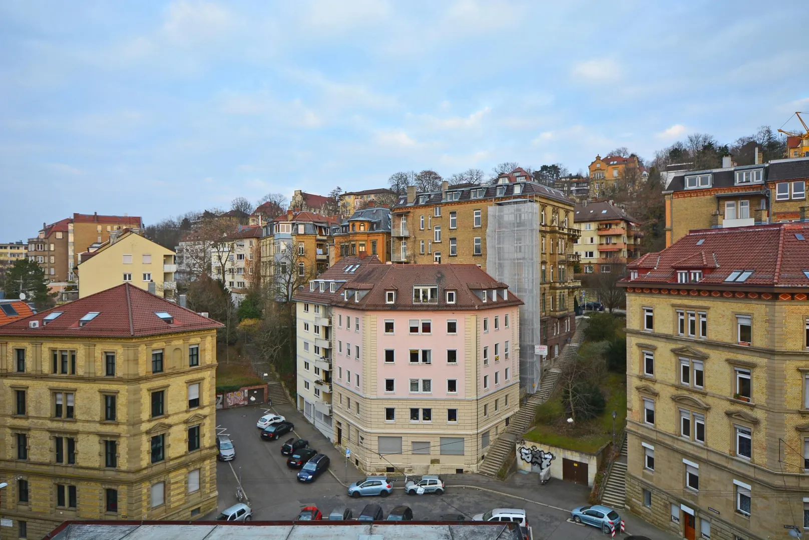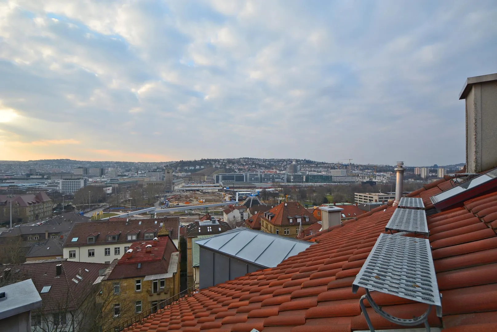 Durch die offene Gestaltung und viele Dachflächenfenster ist die Wohnung hell und sonnig. Das Studio bietet einen traumhaften Fernblick über Stuttgart bis hin zum Fernsehturm.