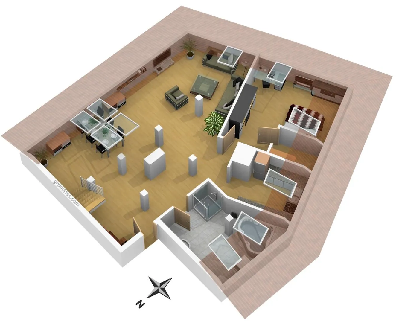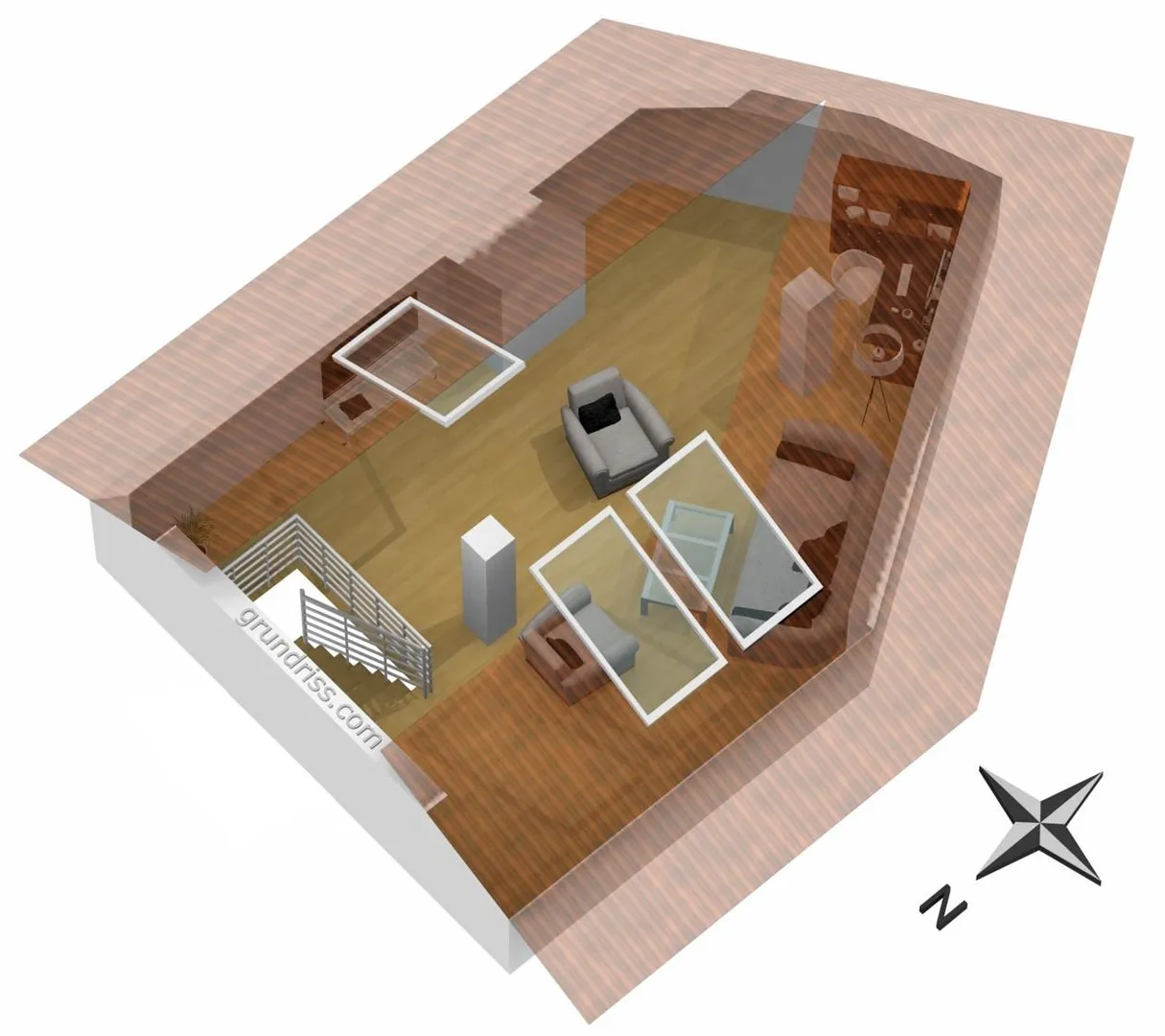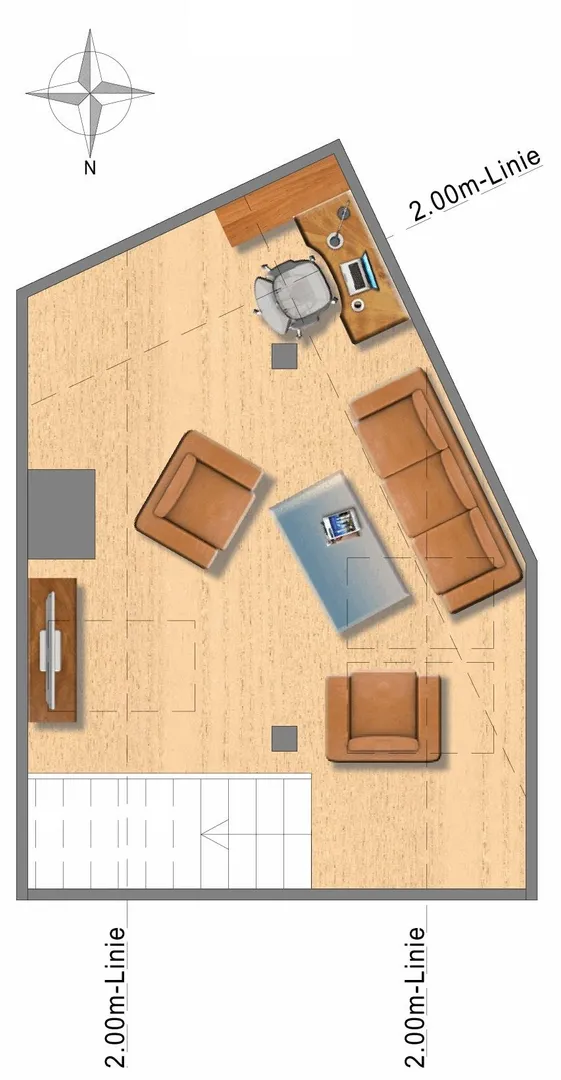 Die Wohnung ist offen gestaltet. Die "Diele" ist zum Wohn-/Essbereich hin offen. Vom Wohn-/Essbereich sind die offene Küche, das Schlafzimmer, das Bad sowie das Studio über einen Treppenaufgang begehbar. Über das Schlafzimmer ist der Abstellraum zugänglich.