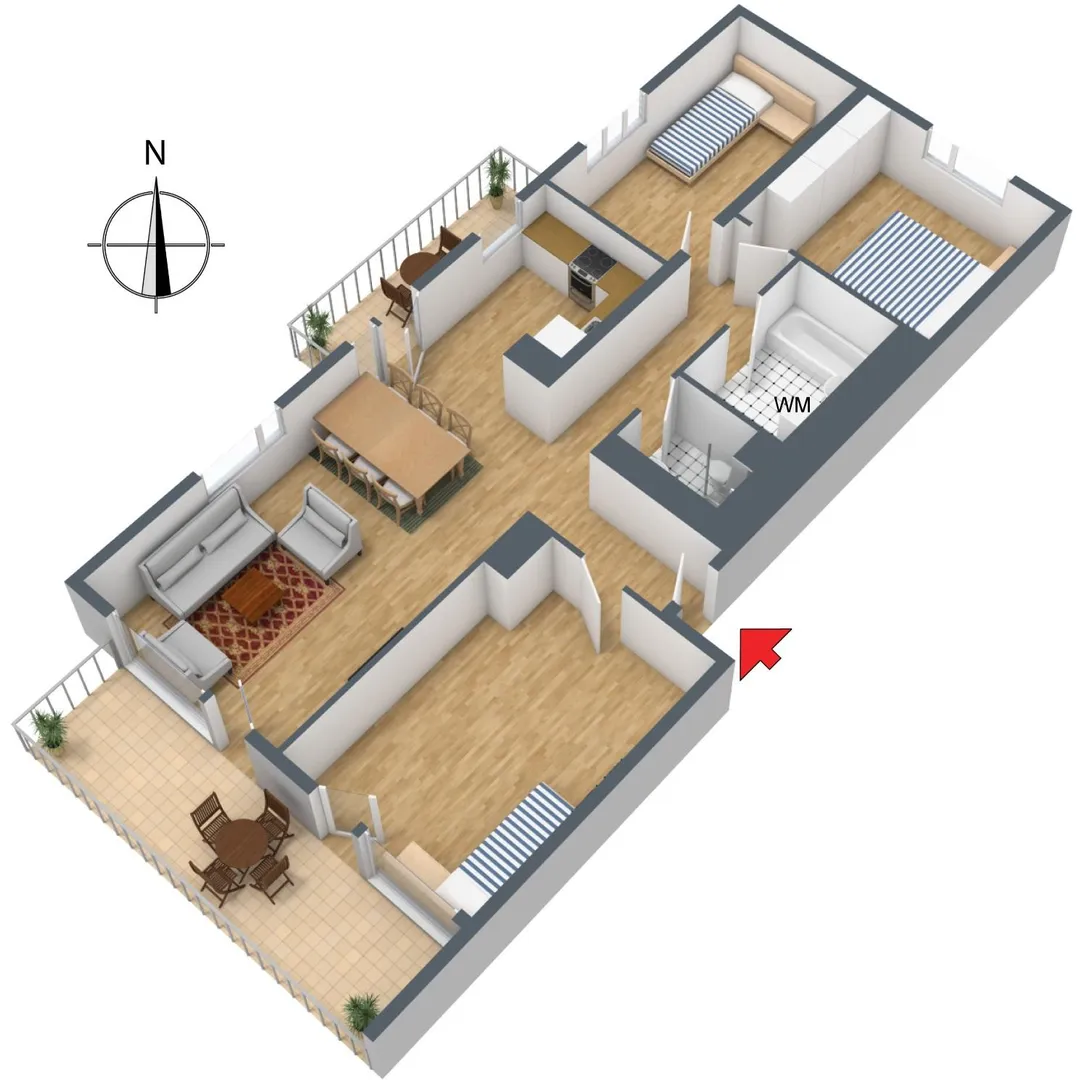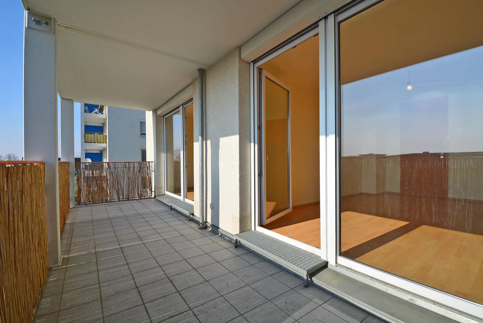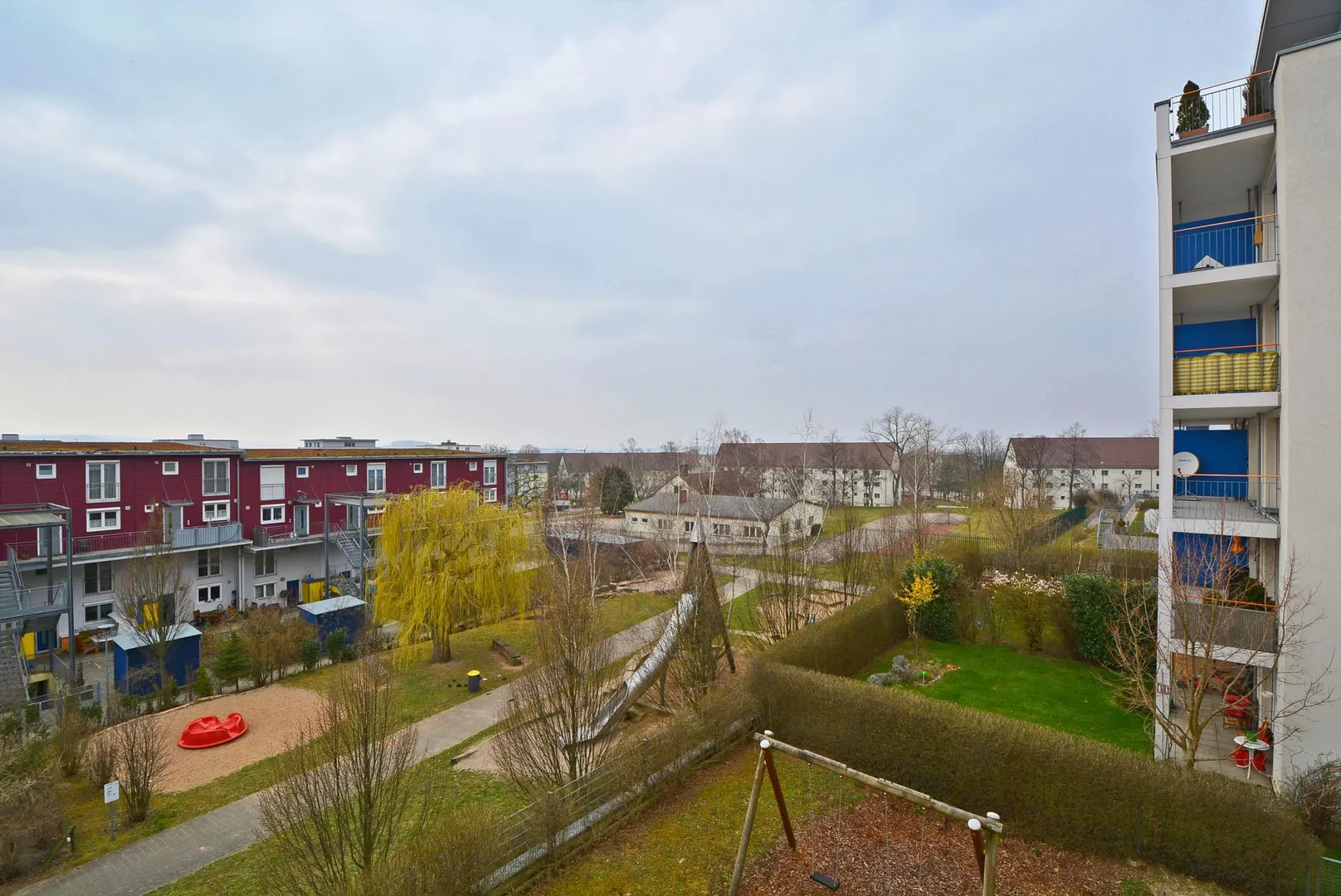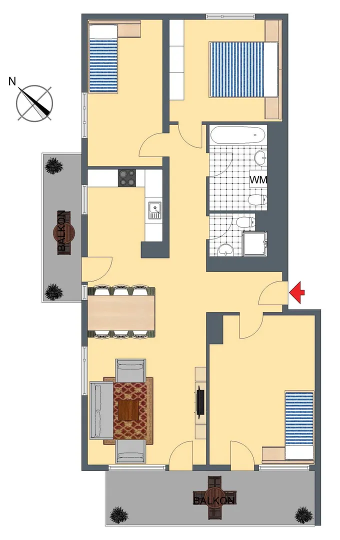 Der kleinere Nordwest-Balkon ist ca. 8 m² groß, überdacht und vom offenen Essbereich zugänglich. Der zweite Südwest-Balkon ist ca. 12 m² groß, überdacht und vom offenen Wohnbereich sowie vom großen Kinderzimmer begehbar.