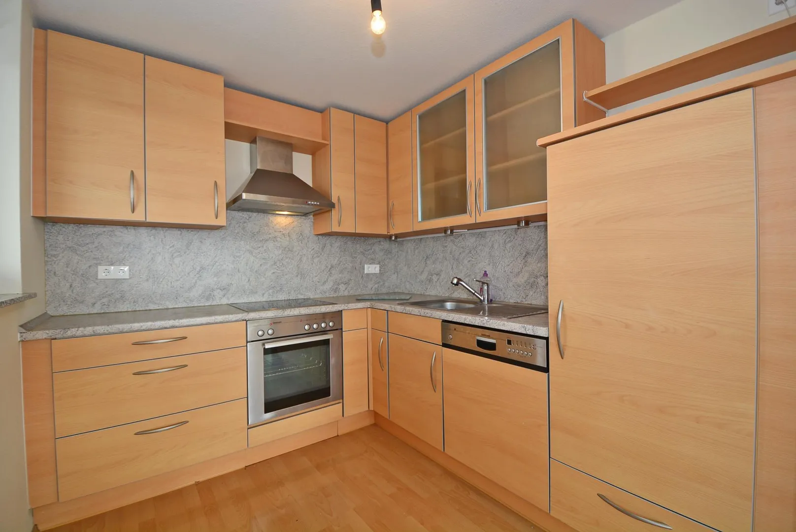 Die offene Küche ist mit einer Einbauküche ausgestattet. Die Einbauküche beinhaltet einen Ceran-Herd, einen Backofen, einen Außen-Dunstabzug, einen Kühl-/Gefrierschrank sowie Ober- und Unterschränke. Die E-Geräte sind funktionsfähig. Für die künftige Funktionsfähigkeit der E-Geräte übernimmt der Vermieter keine Haftung.