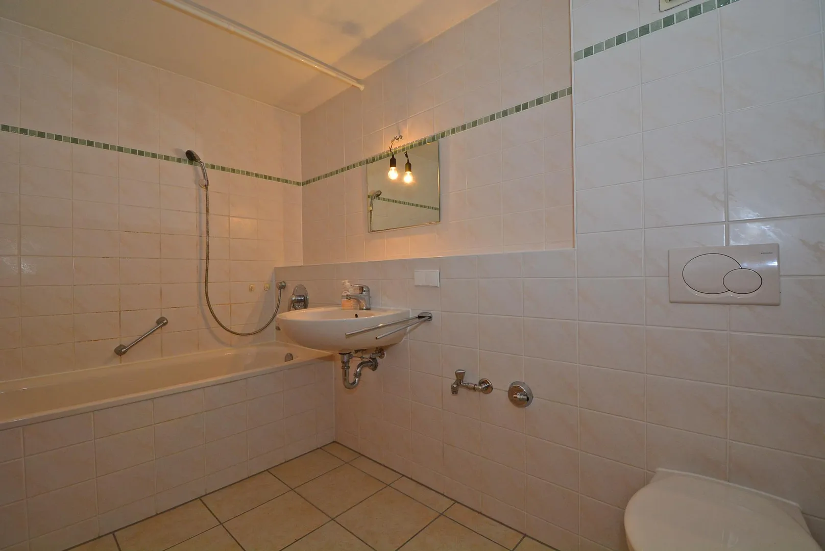 Das größere, raumhoch geflieste Badezimmer ist mit einer Badewanne, einem Waschbecken, einem WC, einem Handtuch-Heizkörper sowie einem Waschmaschinenanschluss ausgestattet.