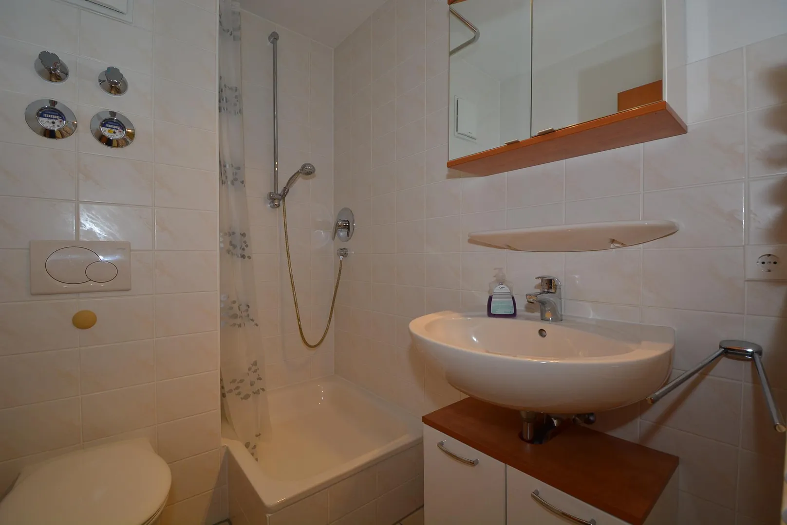Das kleinere, raumhoch geflieste Badezimmer ist mit einer Dusche, einem Waschbecken mit Unterschrank und Spiegelschrank, einem Handtuch-Heizkörper sowie einem WC ausgestattet.
