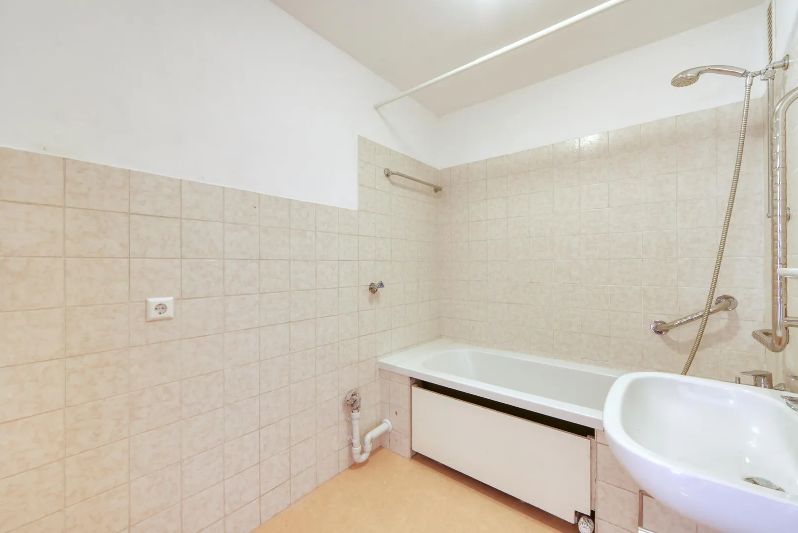 Das teilweise 2/3-hoch und teilweise 1/2-hoch geflieste Badezimmer ist ausgestattet mit einer Badewanne sowie einem Waschmaschinen-Anschluss.