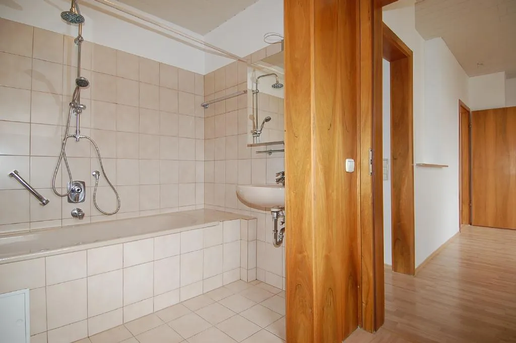 Das Badezimmer ist ein Durchgangszimmer zwischen Esszimmer und Schlafzimmer. Das Bad ist raumhoch gefliest und mit einer Wanne ausgestattet.