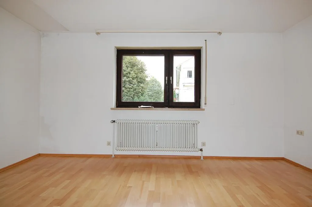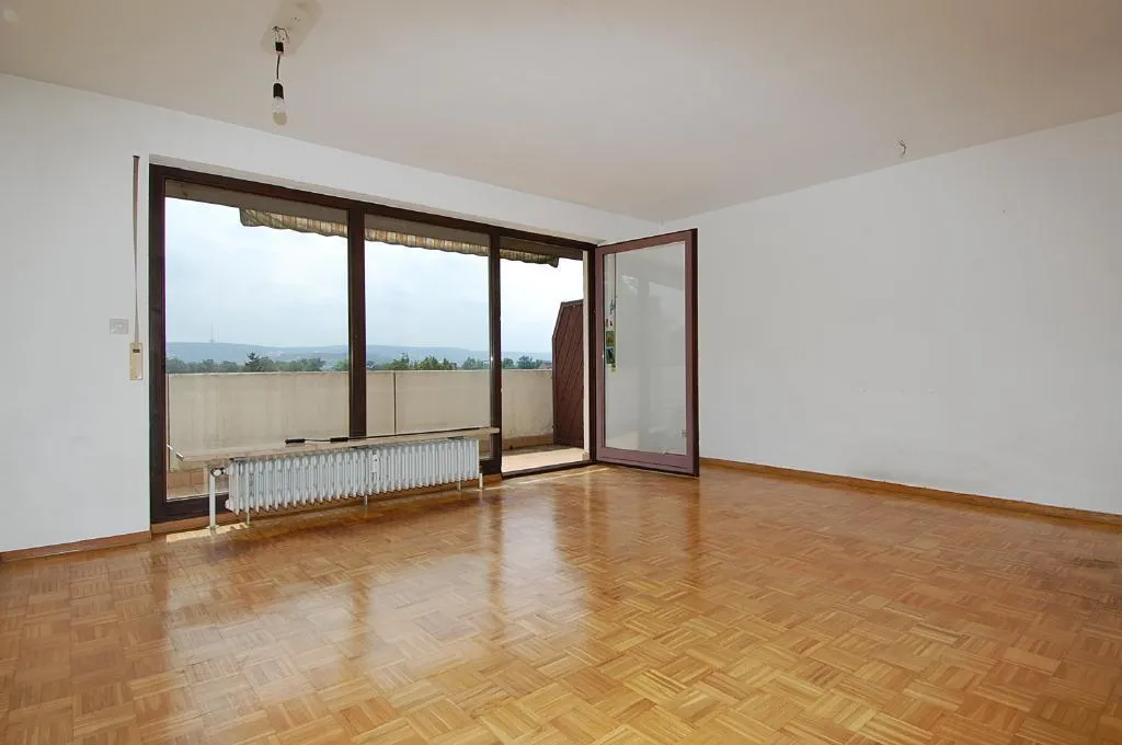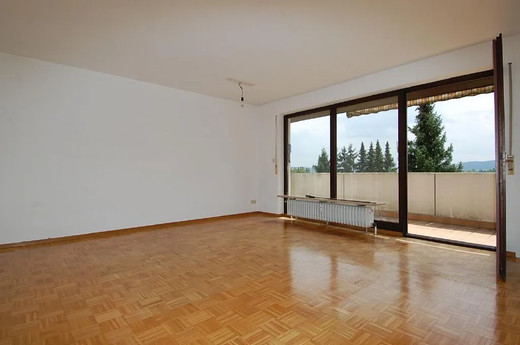 Das Wohnzimmer verfügt über einen Parkettboden, welcher bereits stark abgenutzt ist und frisch abgeschliffen werden sollte.