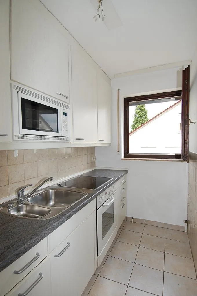 Die Küche ist mit Bodenfliesen und einer älteren Einbauküche mit Kühlschrank, Herd mit Kochfeld, Mikrowelle, Spüle, Schränken und einem Außenabzug für die Dunstabzugshaube ausgestattet.