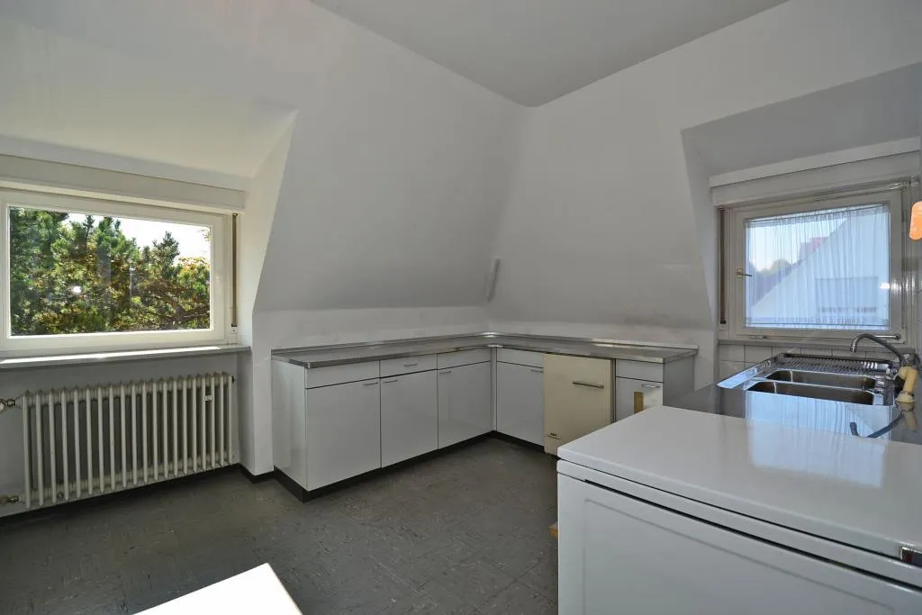 Dachgeschoss: Flur mit Einschubtreppe zur Dachbühne, möbliertes Kinderzimmer, Gästezimmer, Küche mit älterer Einbauküche, neues Tageslichtbad mit Badewanne, Waschmaschinenanschluss sowie mit Zugang zum Abstellraum, separates WC mit Fenster.