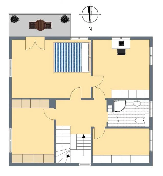 Obergeschoss: Diele, Schlafzimmer mit Zugang zum ca. 5 m² großem Süd-Balkon, Arbeitszimmer, Kinderzimmer, Ankleide mit Einbauschränken, neues Tageslichtbad mit Dusche und WC.