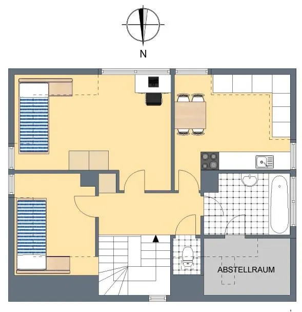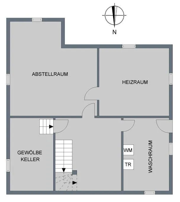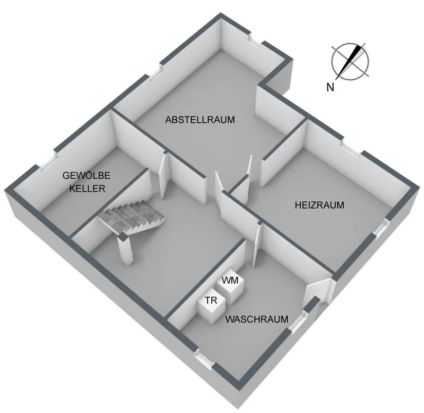 Untergeschoss: Gewölbekeller, Heizraum, Abstellraum, Wasch-/Trockenraum mit direktem Zugang in den Außenbereich.