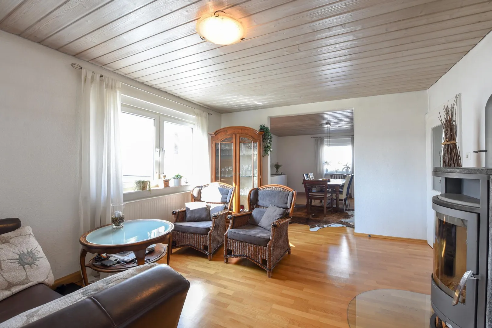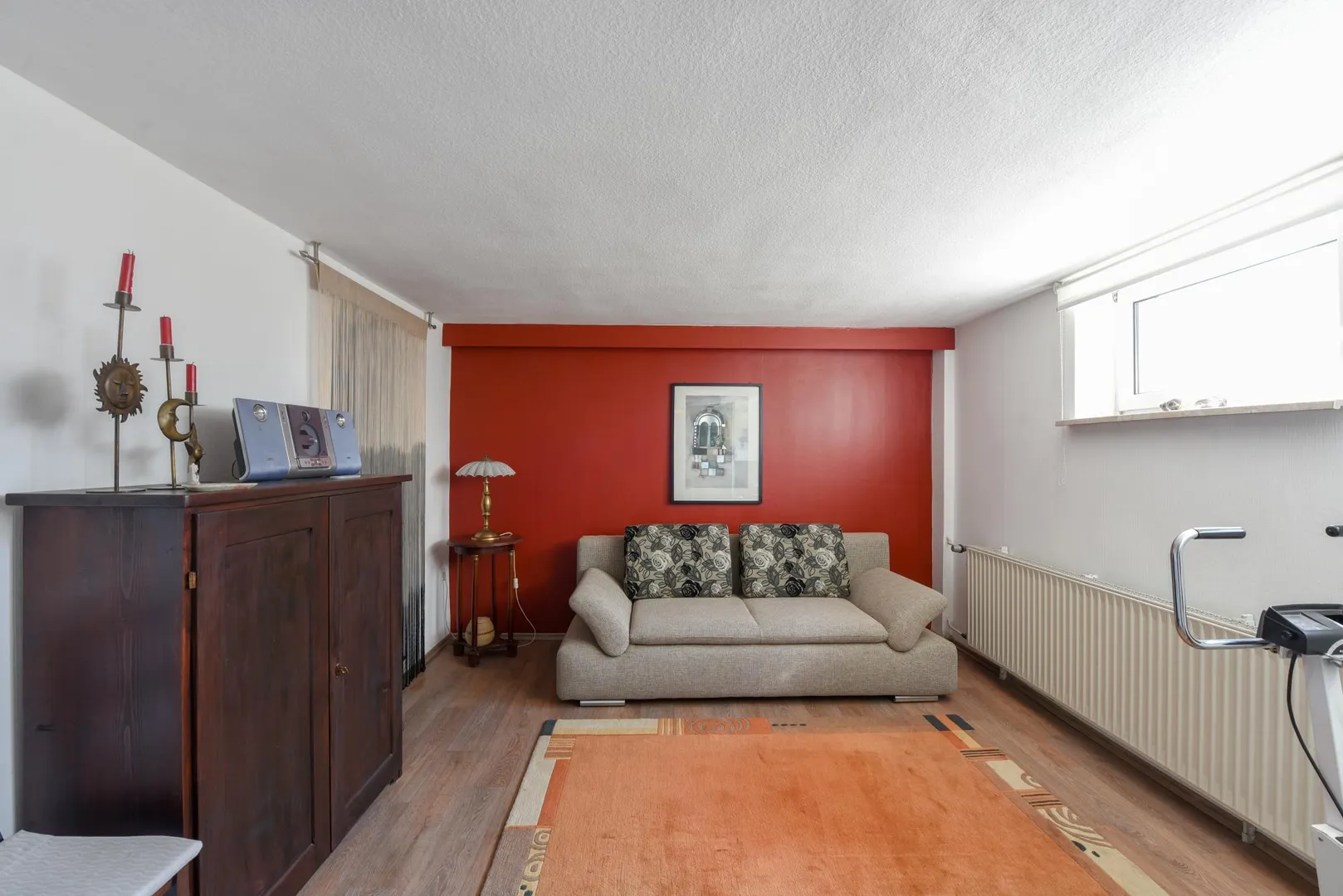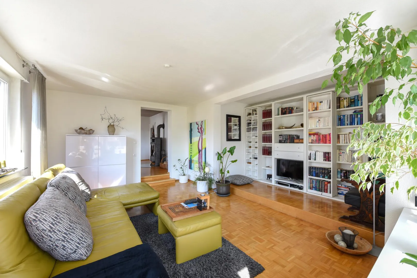 Die 2- bis 3-Zimmer-Wohnung im Erdgeschoss (Hochparterre) mit Einbauküche und Holz-Kamin verfügt über ca. 87 m² Wohnfläche und hat zusätzliche Flächen im Untergeschoss (Hobbyraum, Sauna und zweites "Badezimmer").