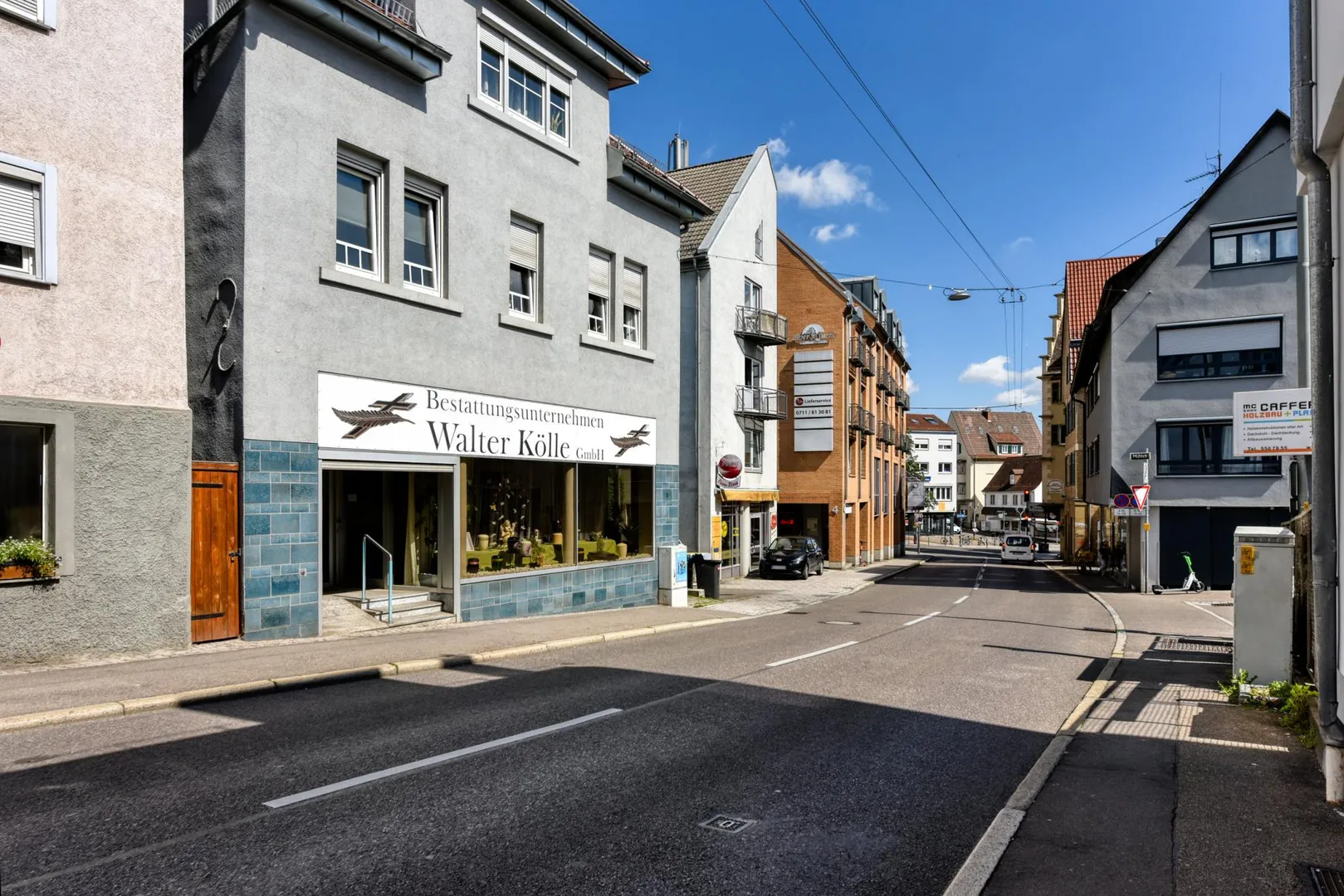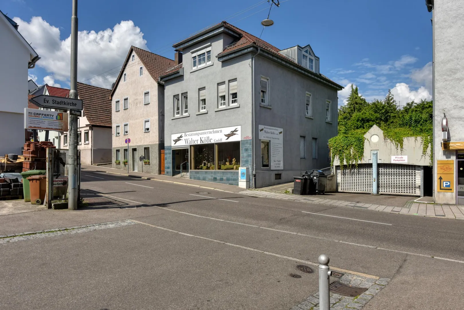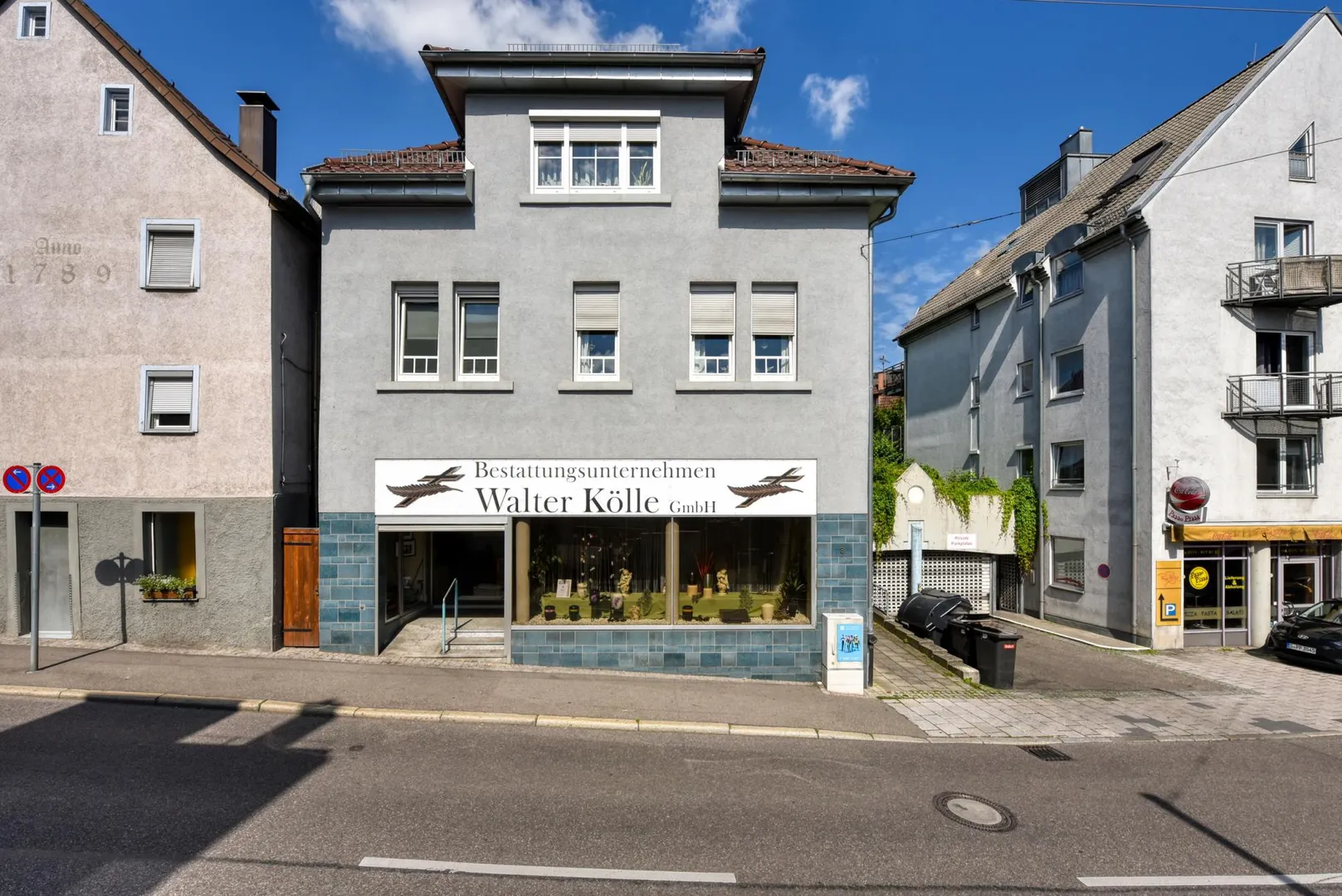 Im Erdgeschoss befindet sich das Bestattungsunternehmen "Walter Kölle", die 4-Zimmer-Obergeschoss-Wohnung ist an eine 4-köpfige Familie seit 2012 vermietet, das Dachgeschoss ist frei.