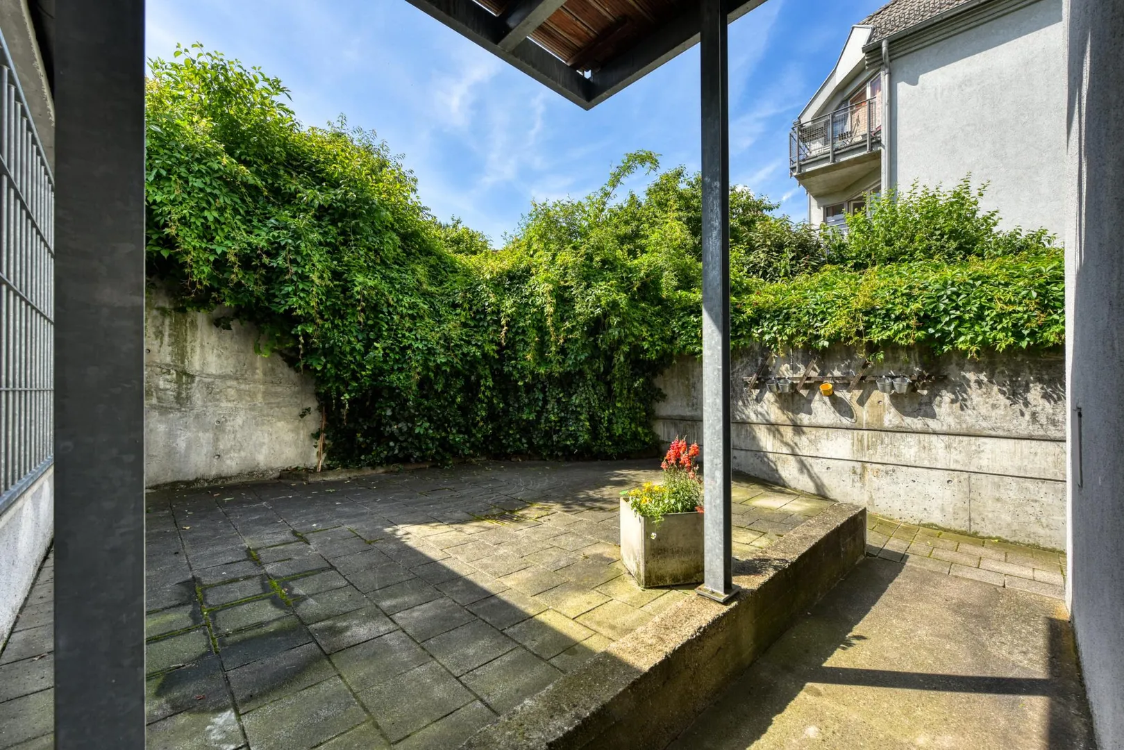 Das Grundstück ist fast rechteckig, von der Straße zum Hauseingang leicht ansteigend und im rückwärtigen Bereich eben. Das Grundstück ist fast komplett, bis auf den Hauszugang und die Terrasse, überbaut.