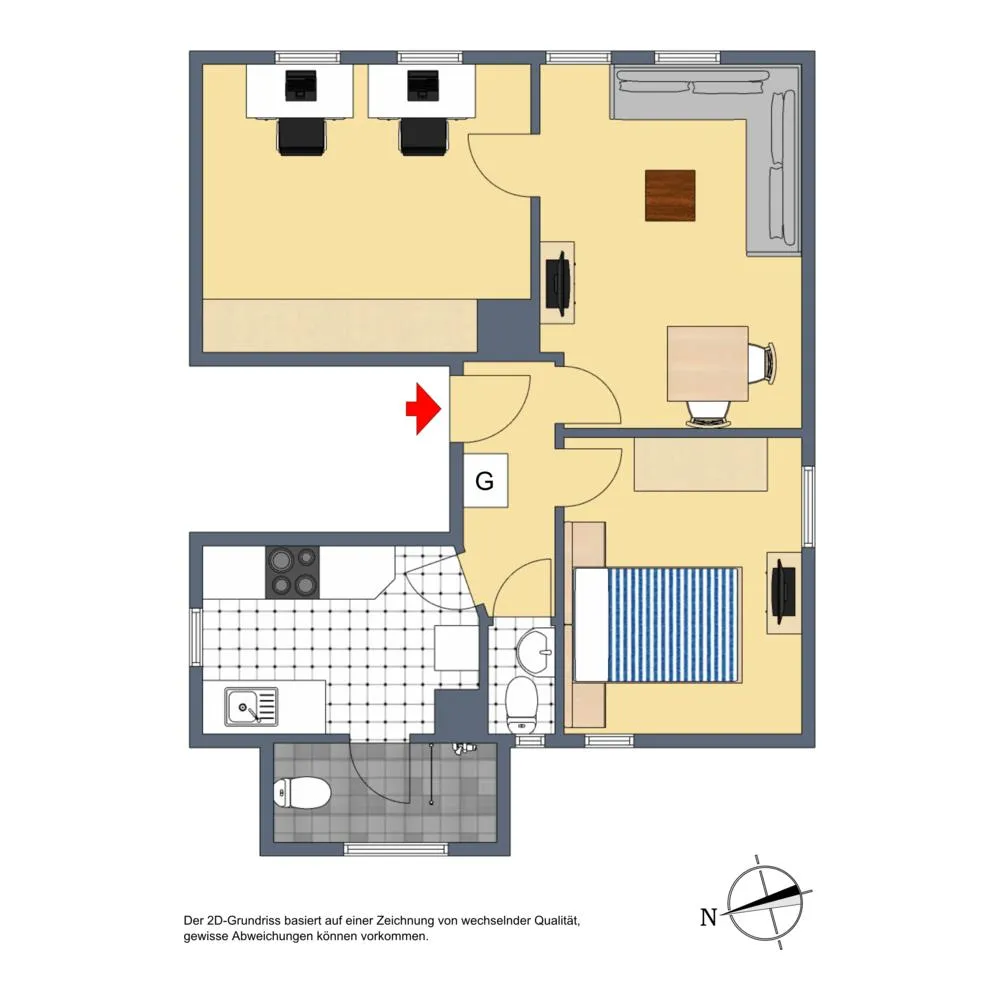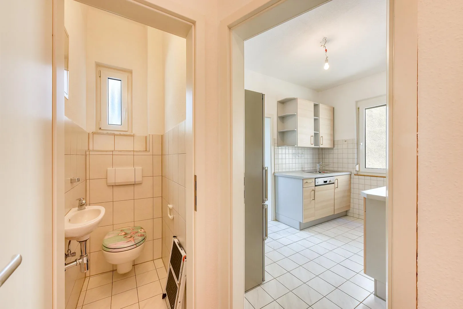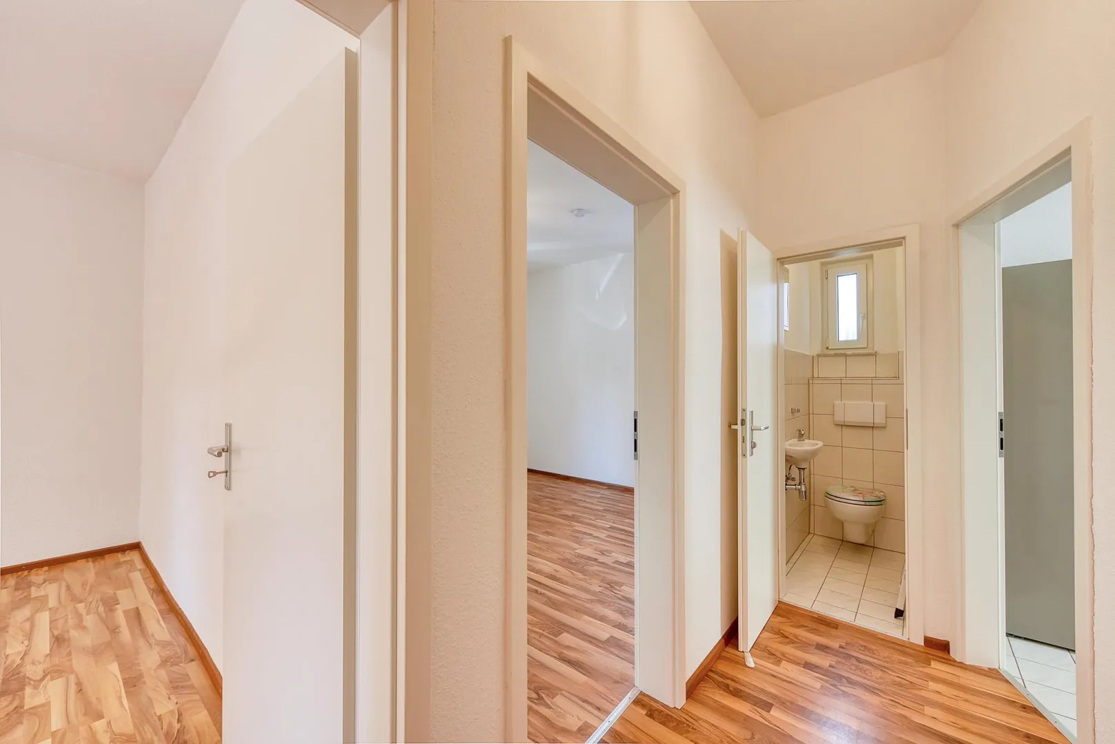 Das Schlafzimmer ist über das Wohnzimmer begehbar. Das Badezimmer mit Fenster ist über die Küche begehbar. Das WC mit Fenster ist separat. Die Wohnung verfügt über keinen Balkon oder keine Terrasse.