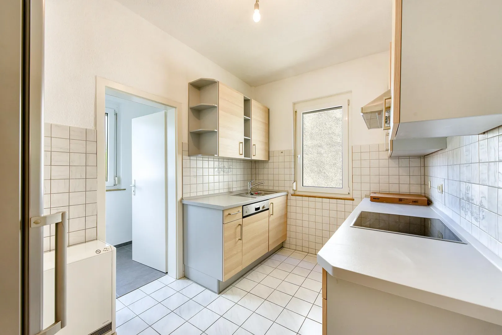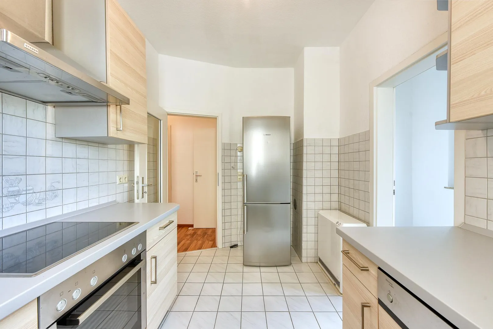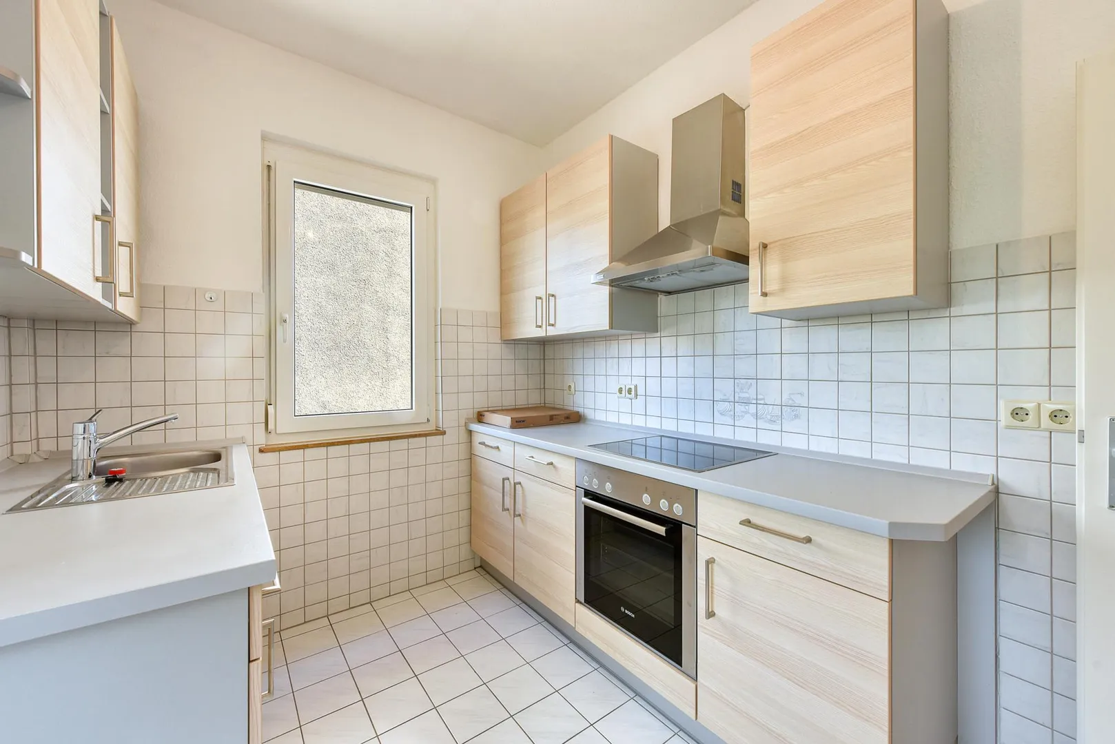 Die Küche ist ausgestattet mit einem Fliesenboden sowie einer Einbauküche.