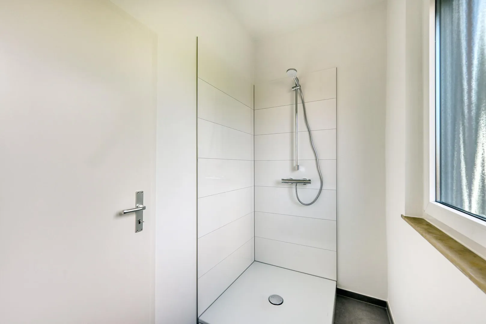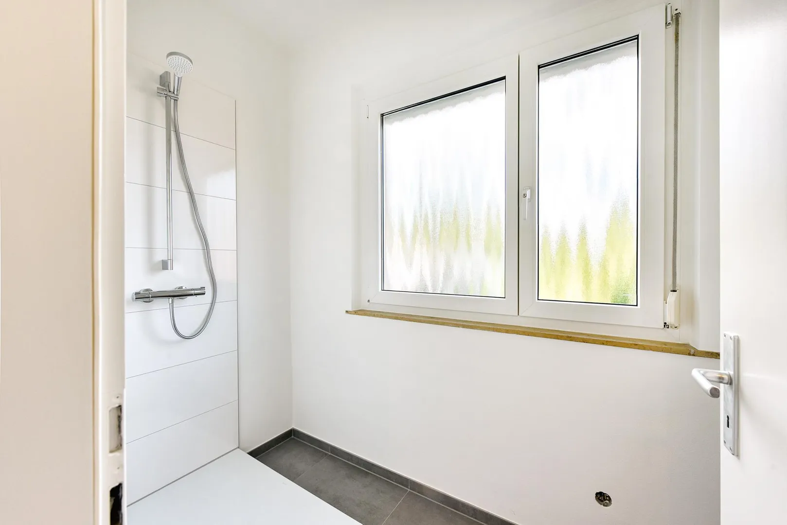 Das Badezimmer mit Fenster ist ausgestattet mit einem Fliesenboden, einer Dusche sowie einem belichteten Spiegel.