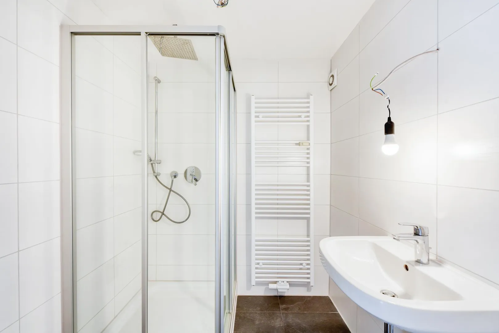 Das raumhoch geflieste Badezimmer ist ausgestattet mit einer Schiebetür, einer Dusche, einem Handtuch-Heizkörper sowie einem Waschmaschinen-Anschluss.