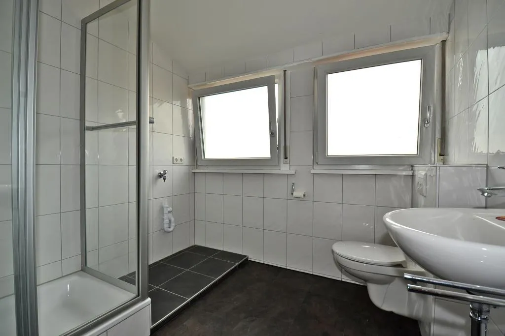Das raumhoch geflieste Badezimmer mit Fenster ist ausgestattet mit einem Fliesenboden, einer Dusche, einem Handtuch-Heizkörper, einem WC sowie einem Waschmaschinenanschluss.