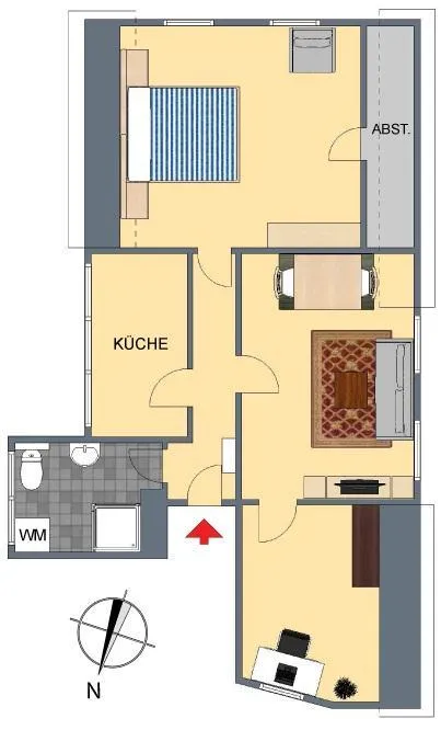Der Grundriss ist einfach. Die Wohnung verfügt über keinen Balkon. Das dritte Zimmer ist über das Wohnzimmer begehbar.