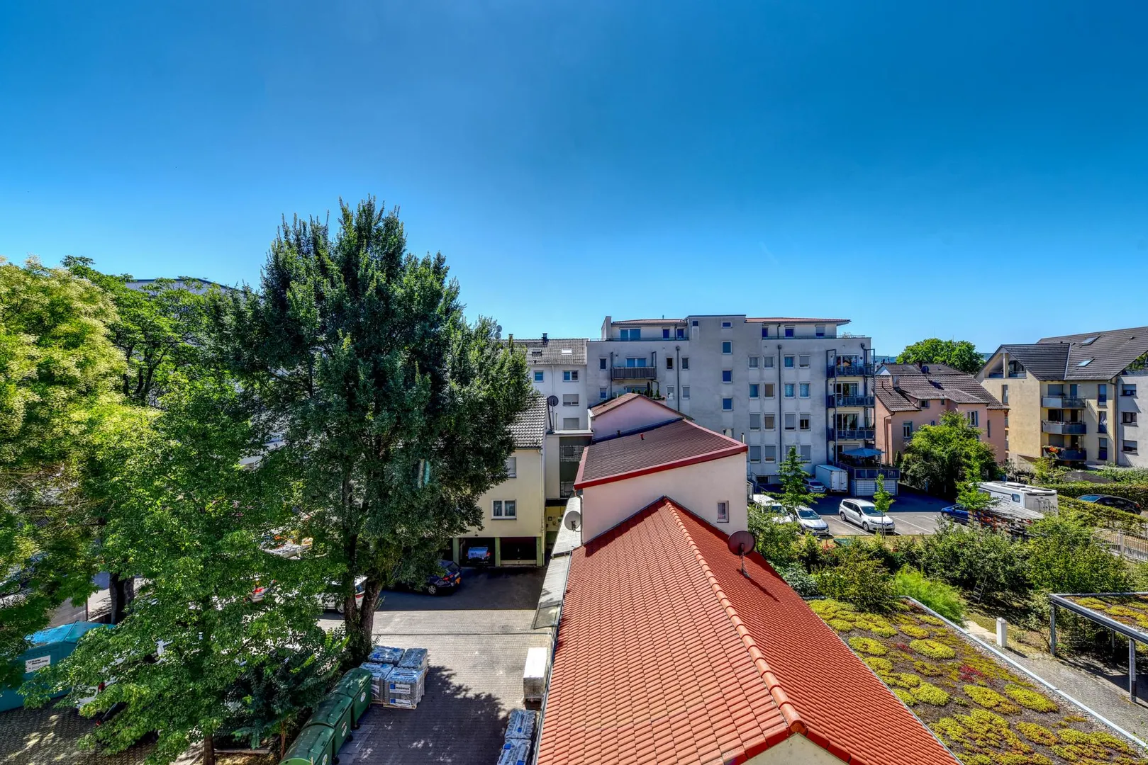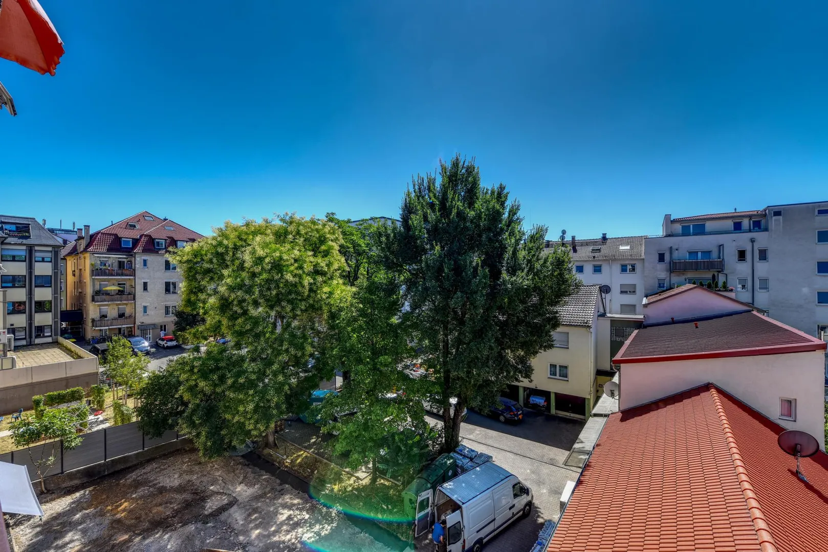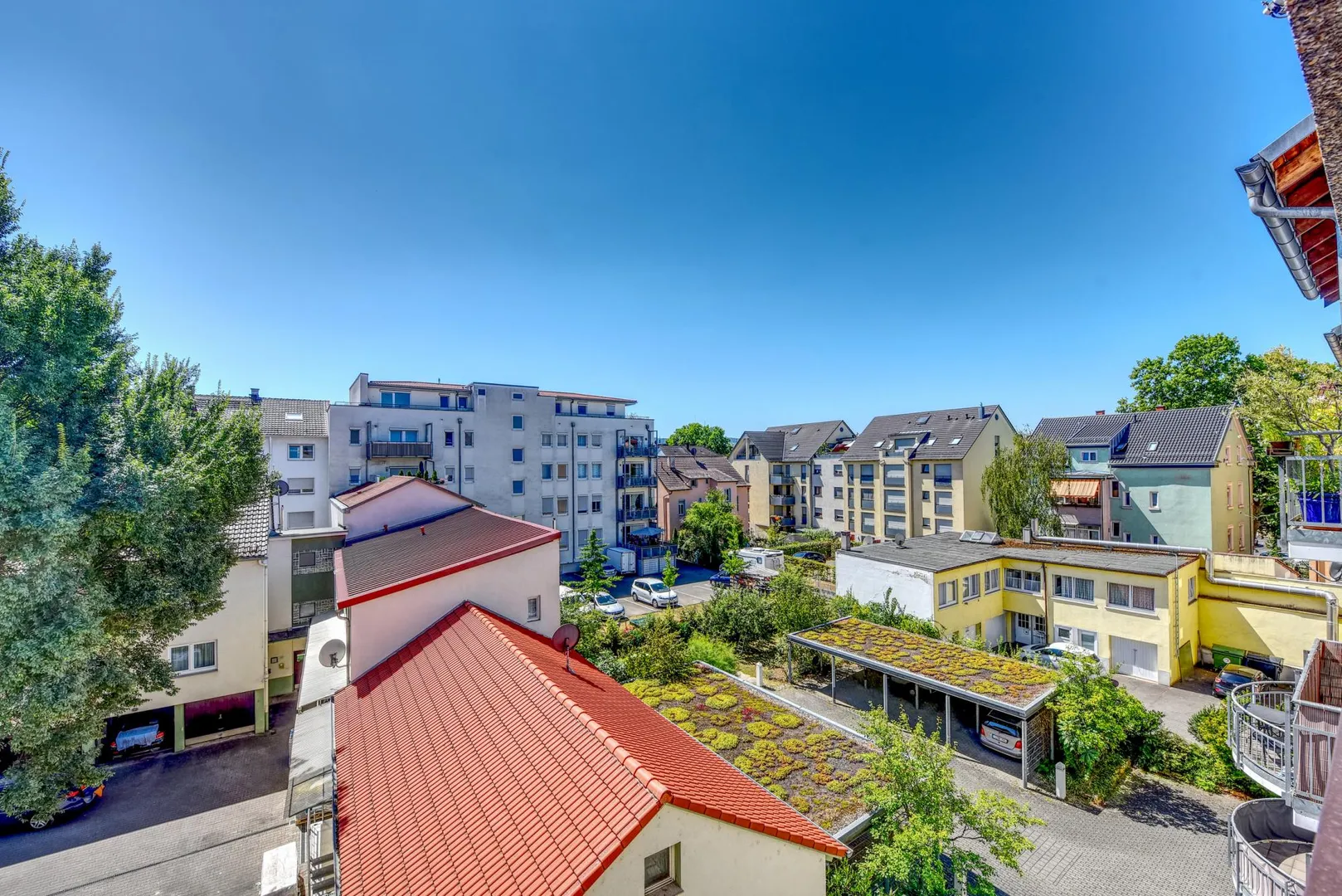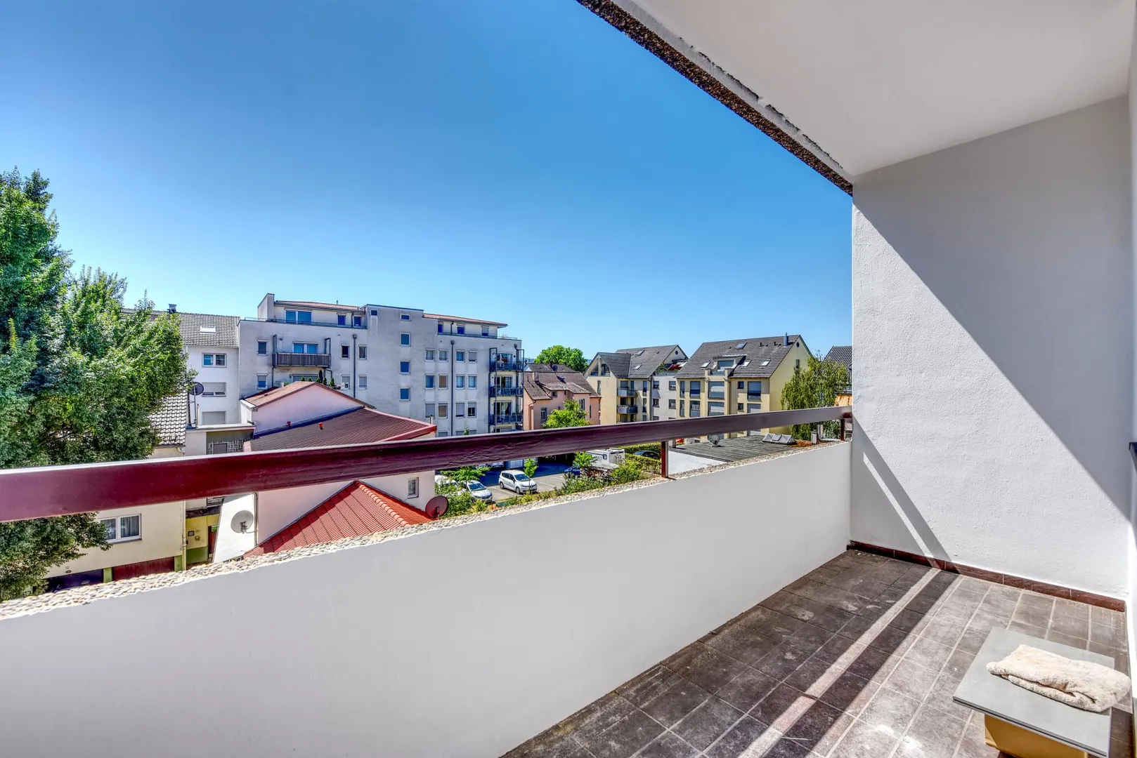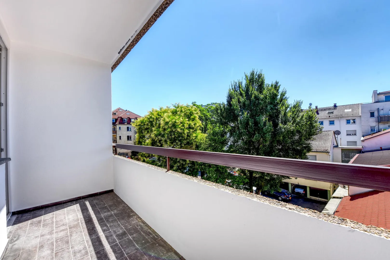 Der ca. 4,5 m² große und überdachte Süd-Balkon (zum Innenhof) ist vom Zimmer begehbar.