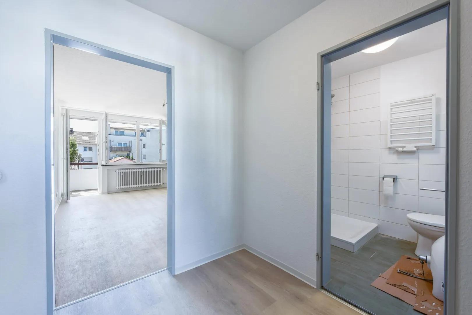 Aktuell wurden im Flur und im Zimmer neue Vinyl-Design-Böden verlegt. Die Wände sind mit Raufasertapeten tapeziert und wurden frisch, weiß gestrichen.