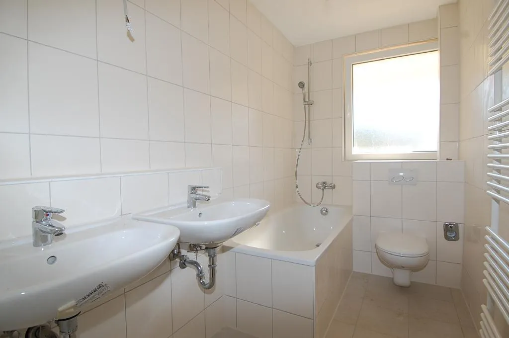 Das Tageslicht-Badezimmer ist raumhoch gefliest und verfügt über ein Fenster, Bodenfliesen, eine Wanne, ein WC, 2 Waschbecken, einen Handtuch-Heizkörper.