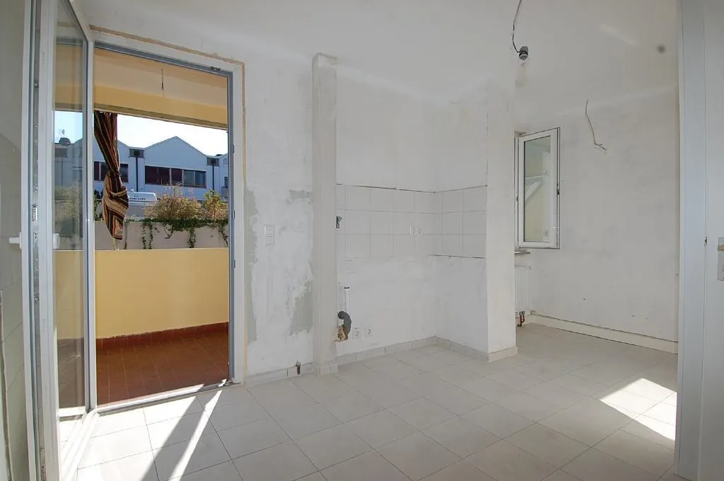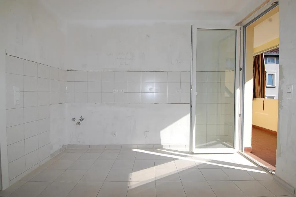 Die Küche verfügt über einen Fliesenboden, einen Balkon, und einen Waschmaschinenanschluss.