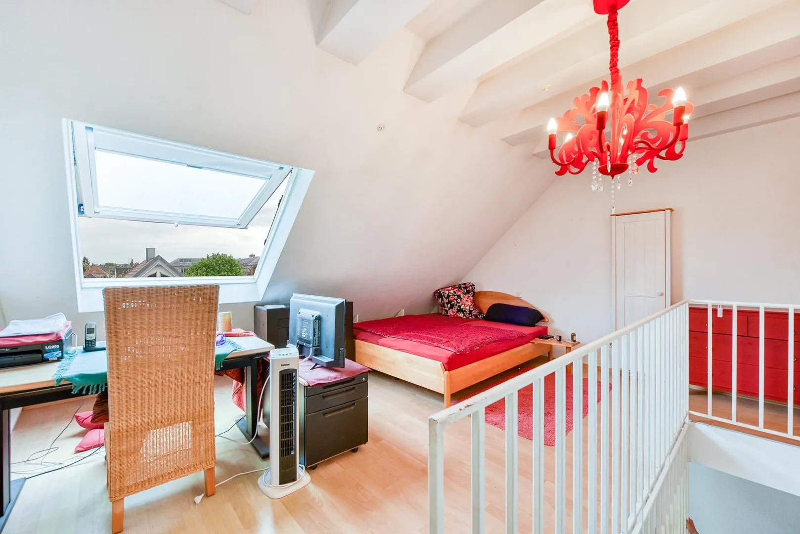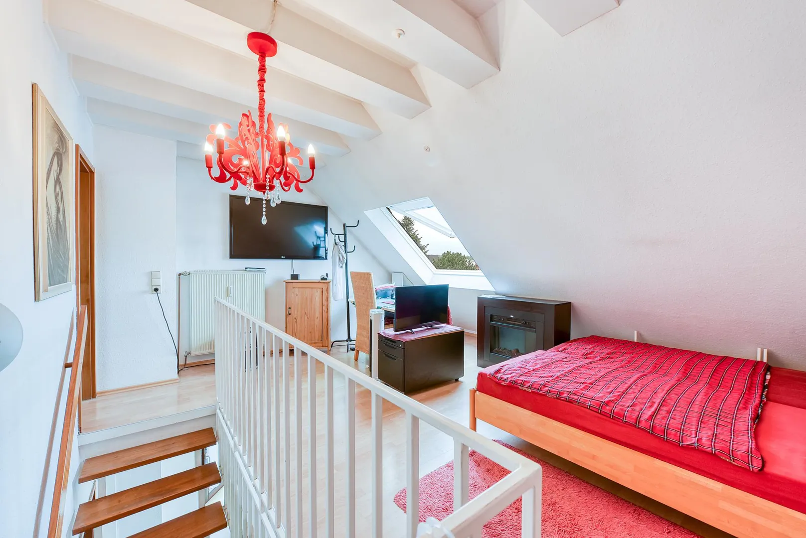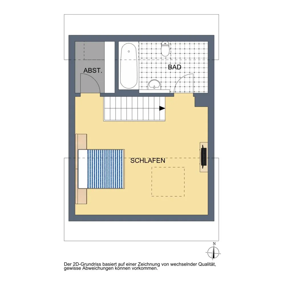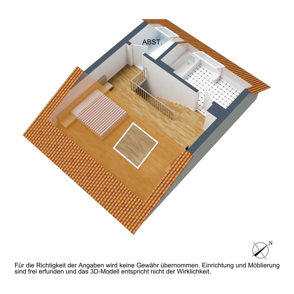 Auf der oberen Ebene (Dachgeschoss) befindet sich der offene Schlafbereich, das Badezimmer sowie ein Ankleideraum.